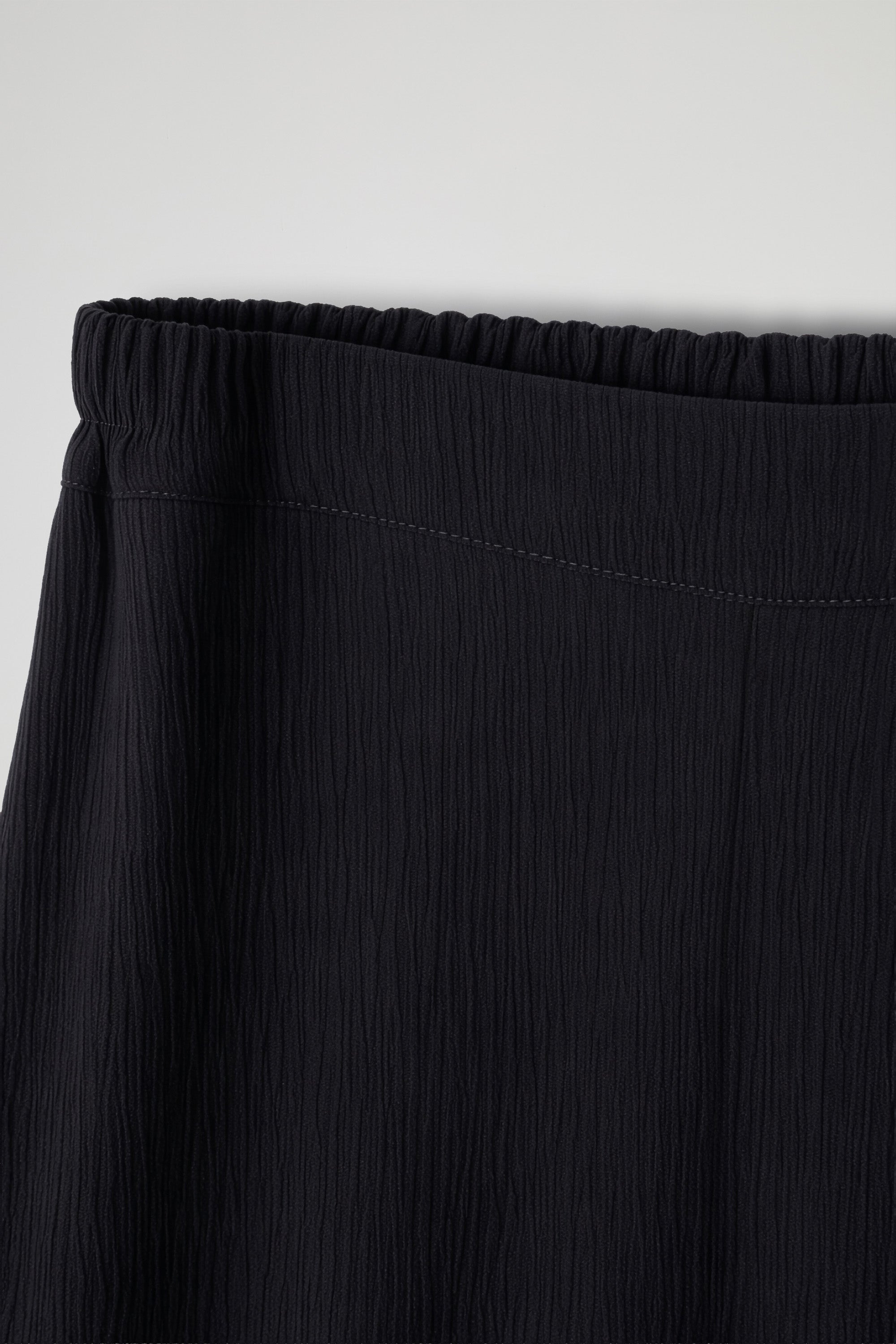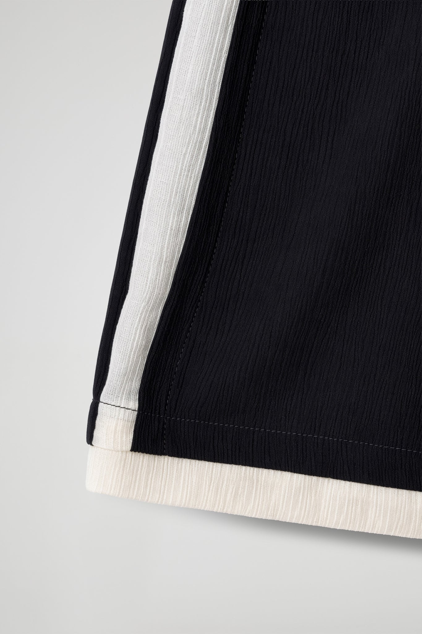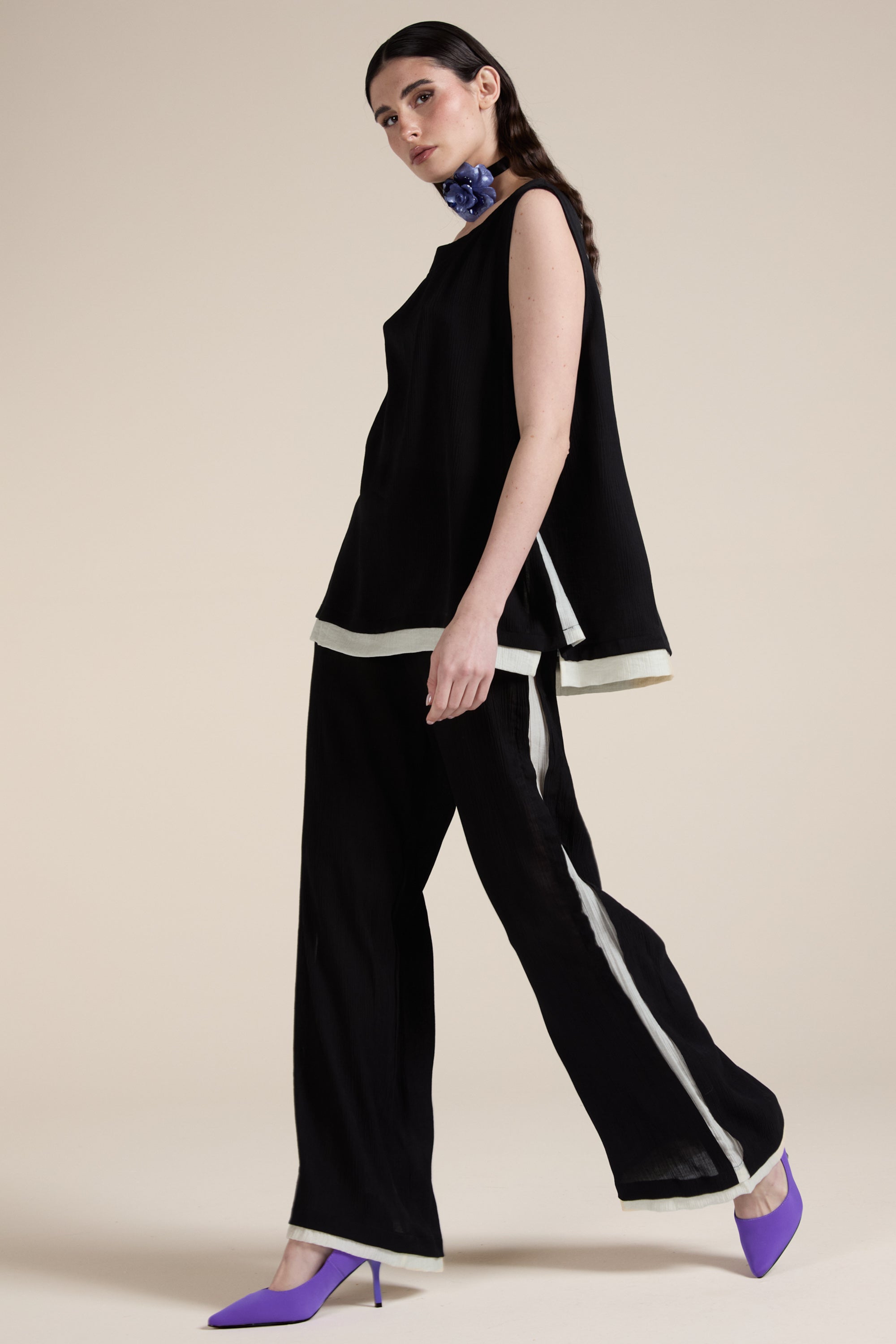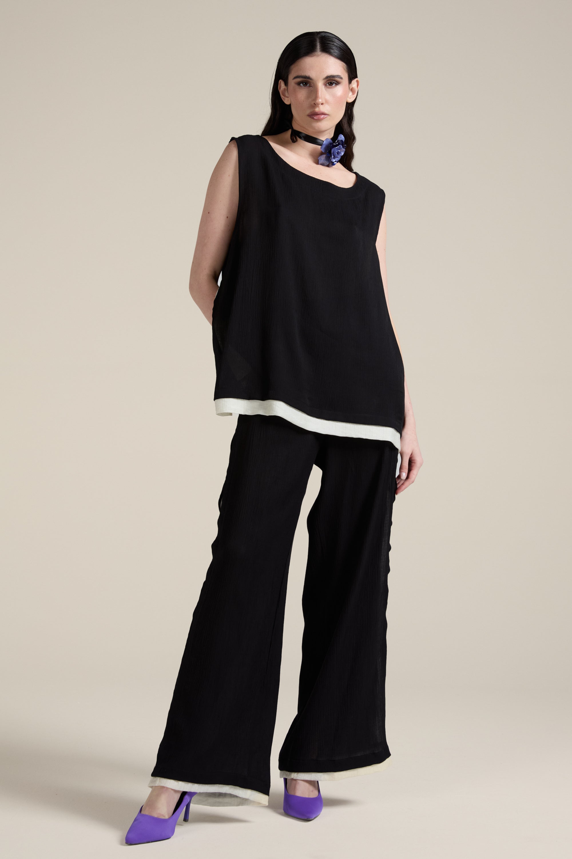 Long trousers with a wide and flowing cut, made of lightweight fabric with a slightly crinkled texture; high waist with a smooth band and soft line, contrasting color detail that runs straight down the leg, adding a distinctive touch. Essential garment with a minimalist style, perfect for both casual and more sophisticated looks.