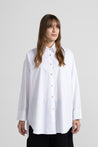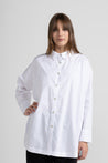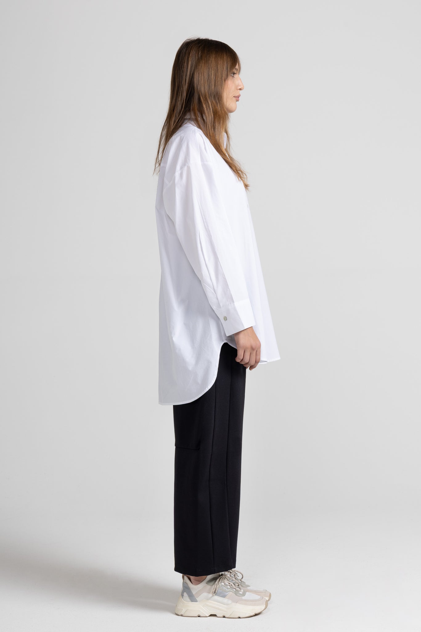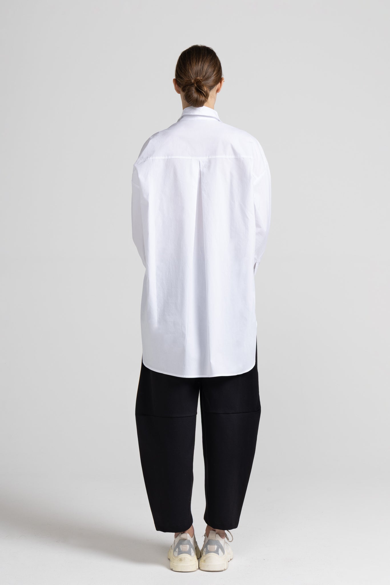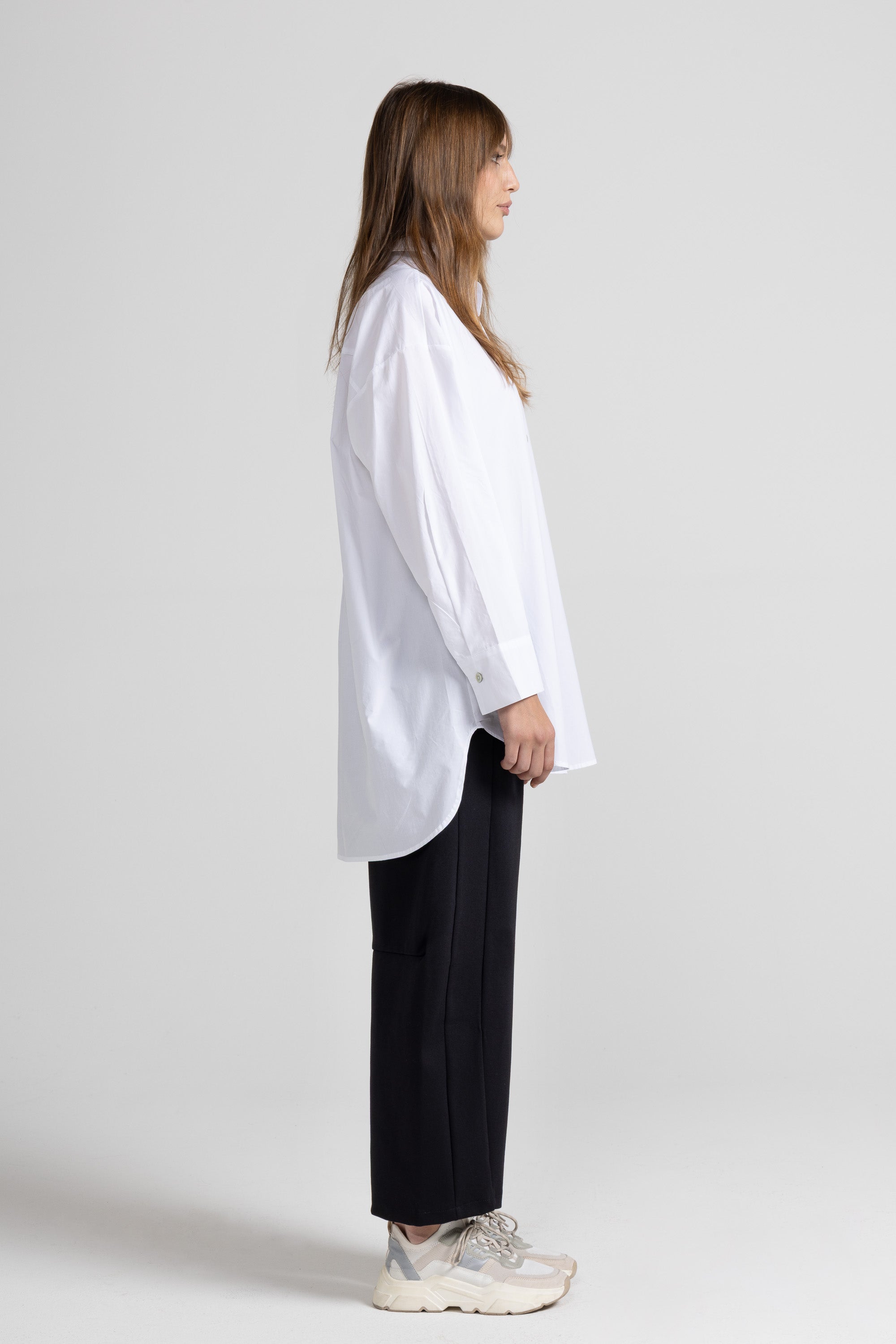 Long asymmetrical cotton poplin shirt with a spread collar, long sleeves with high folded cuffs, a slit, and a button closure, a front button fastening, and a petal hem. Flared fit.