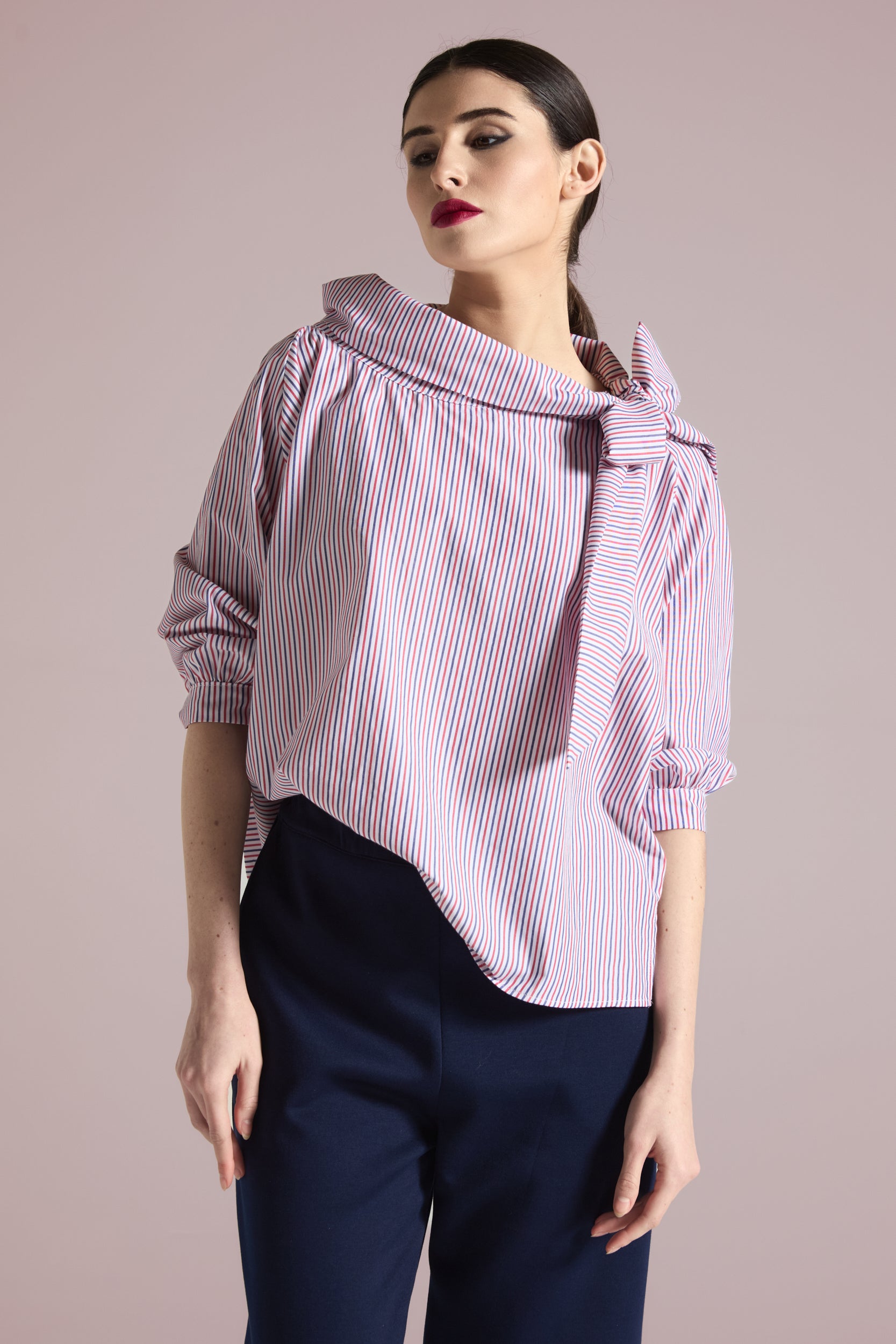 A refined blouse featuring a vertical striped pattern. The design stands out for its soft high neck with a drawstring that ties into an elegant side bow, adding movement and a feminine touch. The 3/4 sleeves with cuffs and a slightly flared line ensure a comfortable and versatile fit.