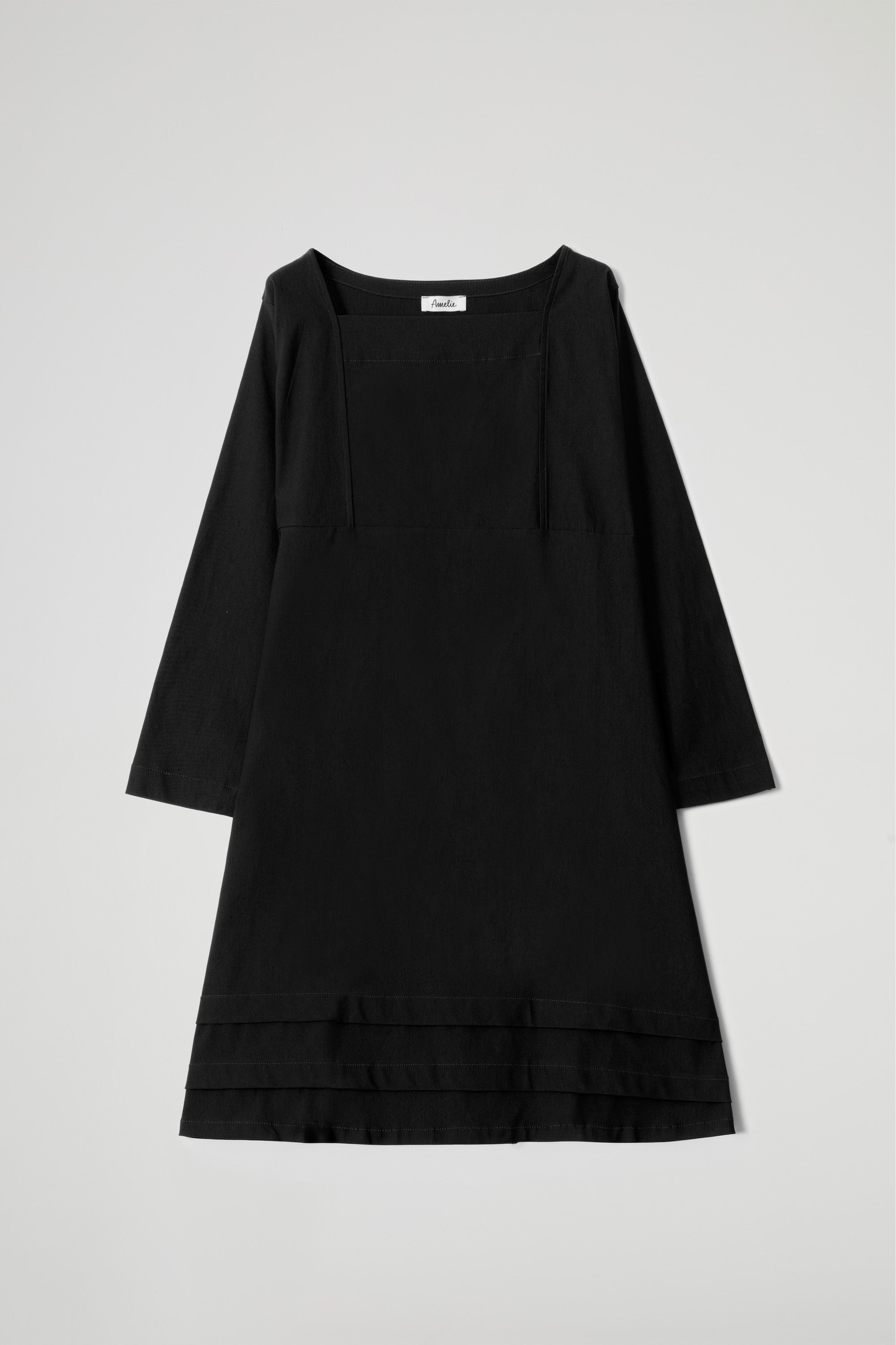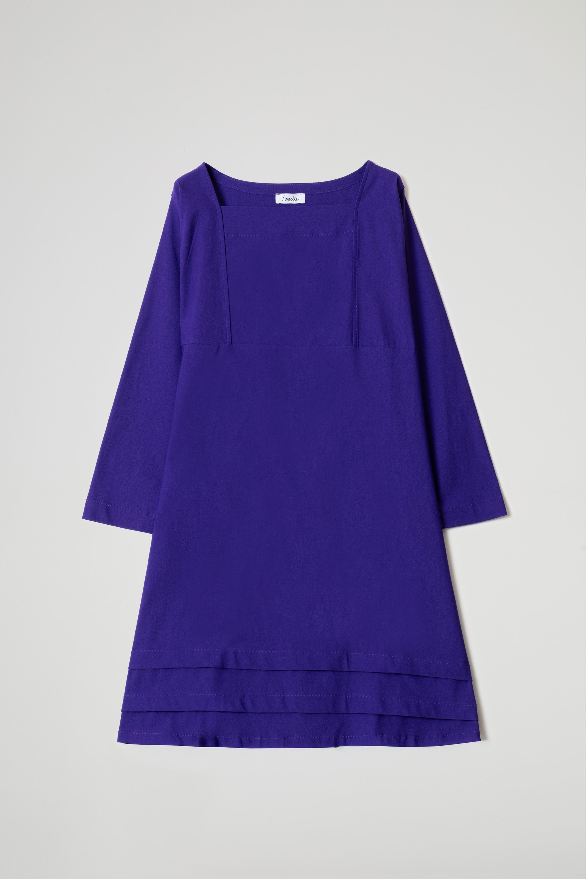 Abito midi in bengalina di viscosa, linea svasata, manica lunga, corpetto geometrico con taglio sotto il seno e scollo squadrato, tasche a filo, dettaglio doppie balze impunturate sull’orlo.