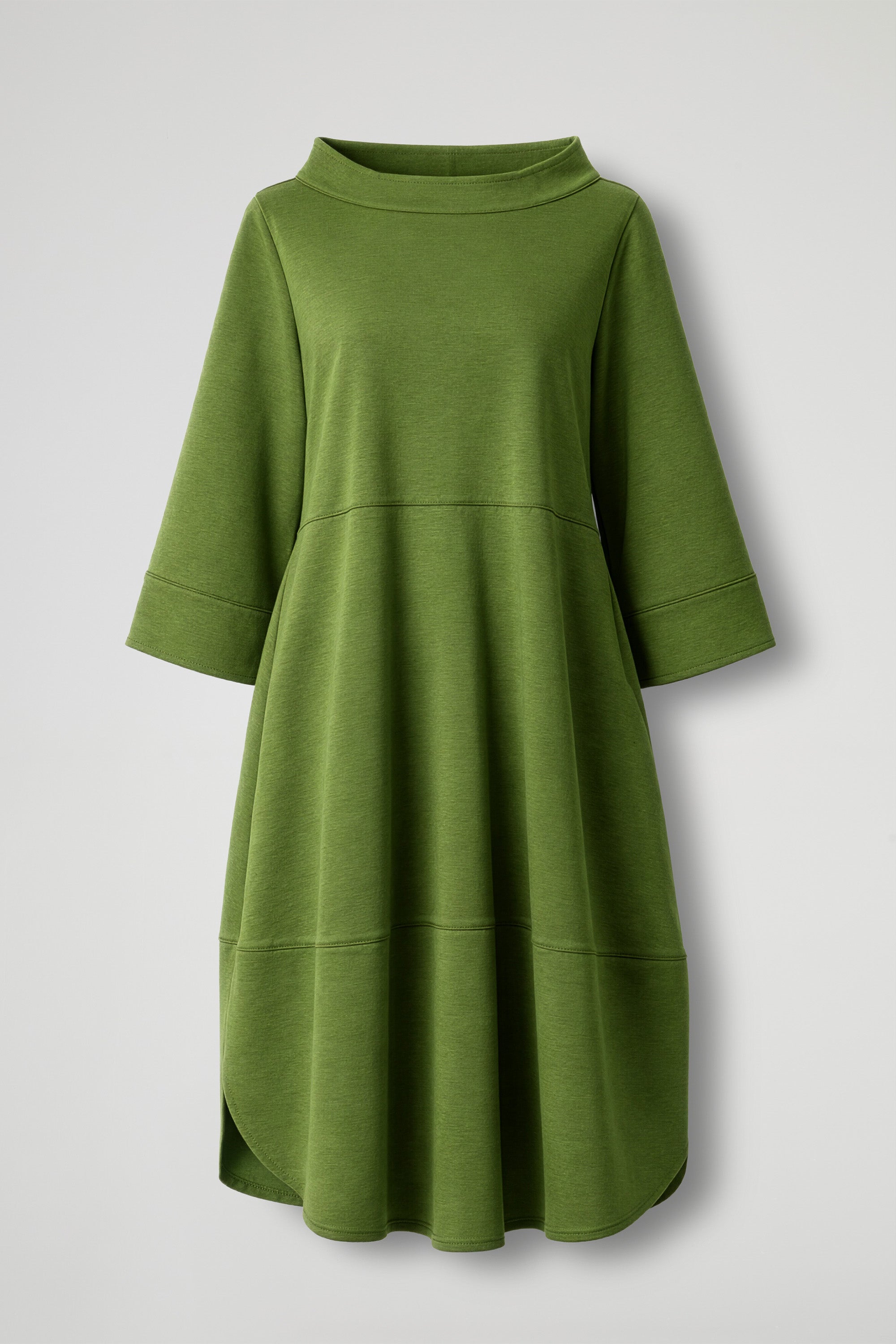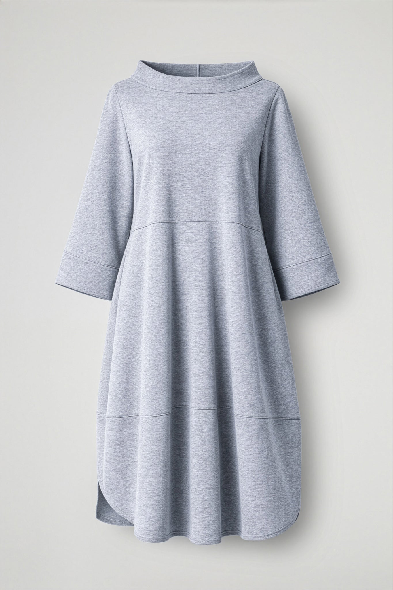 Abito realizzato in tessuto di viscosa, unendo praticità ed eleganza in un design essenziale ma ricercato .La linea ampia e fluida accompagna delicatamente le forme, mentre i tagli orizzontali donano movimento e carattere al capo, creando una silhouette moderna e armoniosa. Il collo rotondo e le maniche a tre quarti dal taglio morbido aggiungono un tocco contemporaneo e rilassato, perfetto per un look casual-chic.