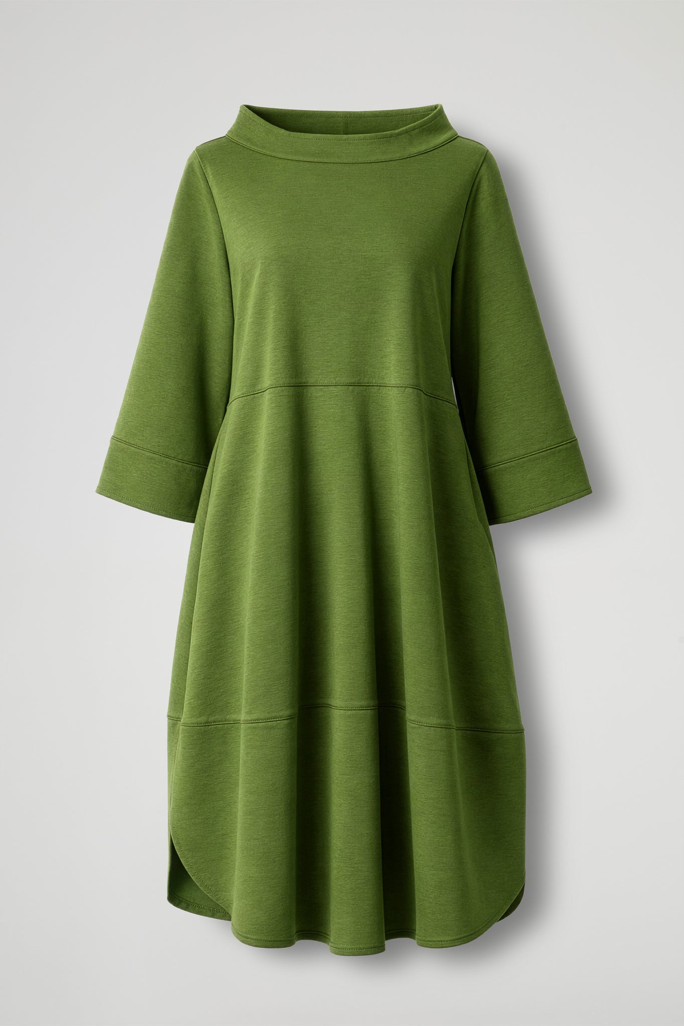 Abito lungo, collo in piedi ampio e rotondo con orlo ribattuto alto, maniche a ¾ con orlo ribattuto alto, tasche a filo, cuciture orizzontali decorative, orlo a petalo sul fondo. Linea ampia.