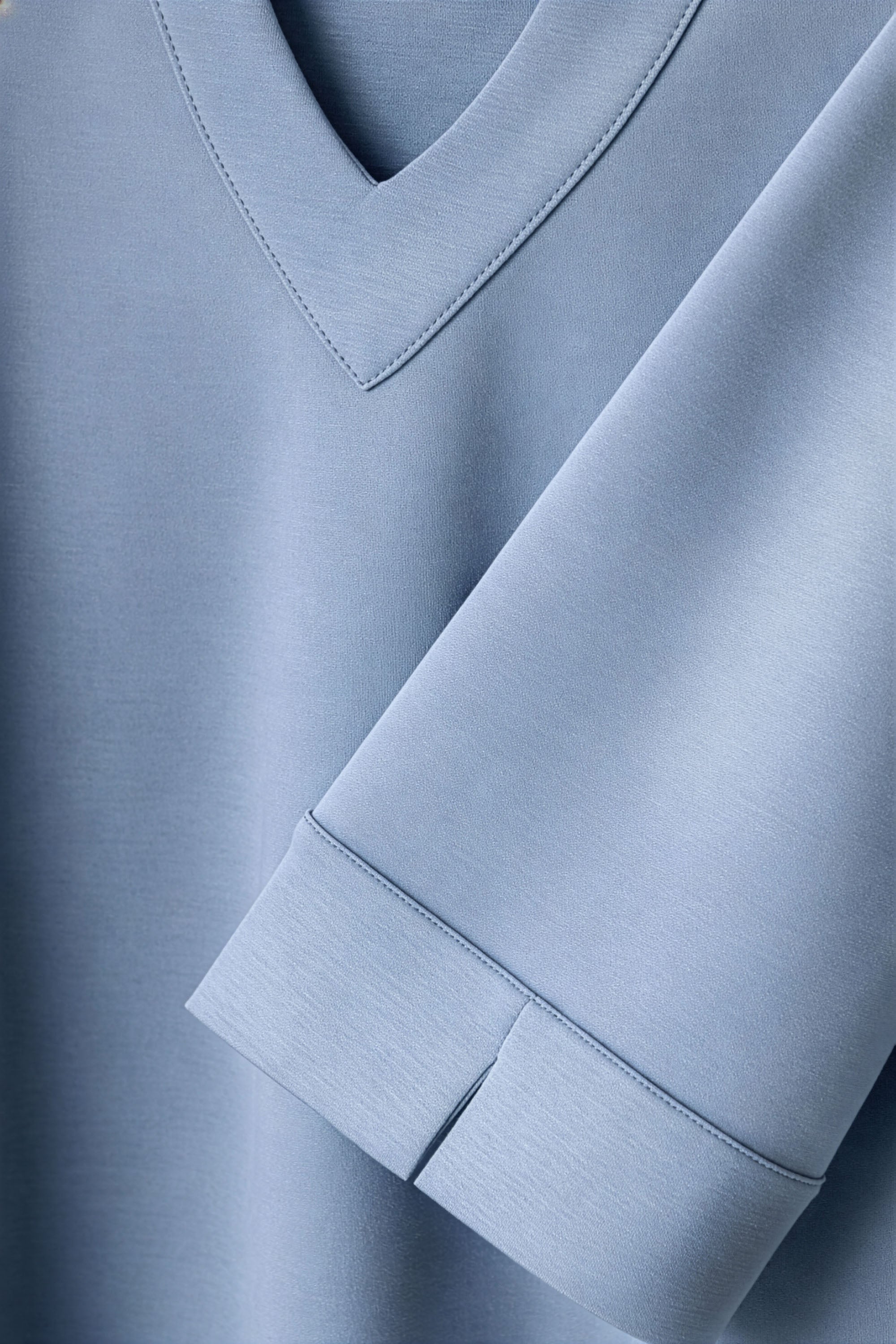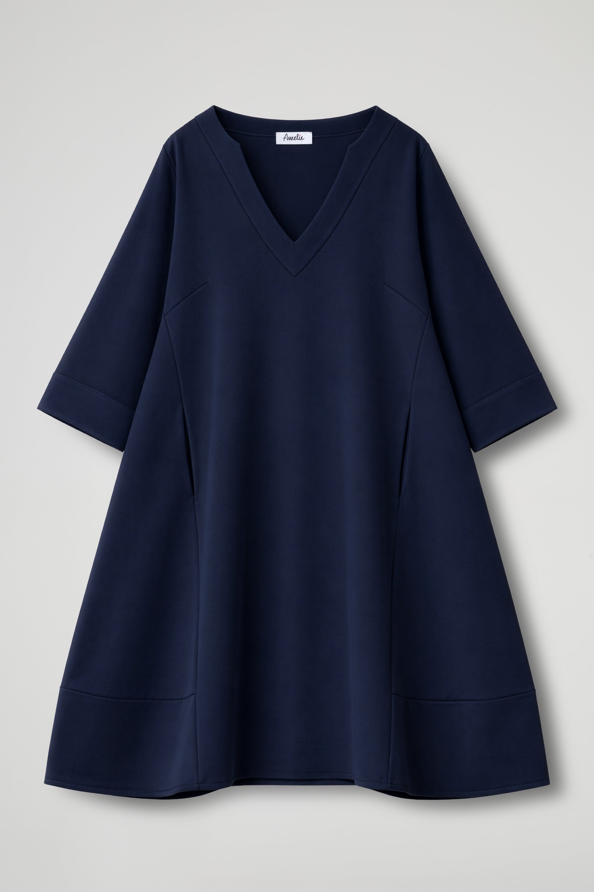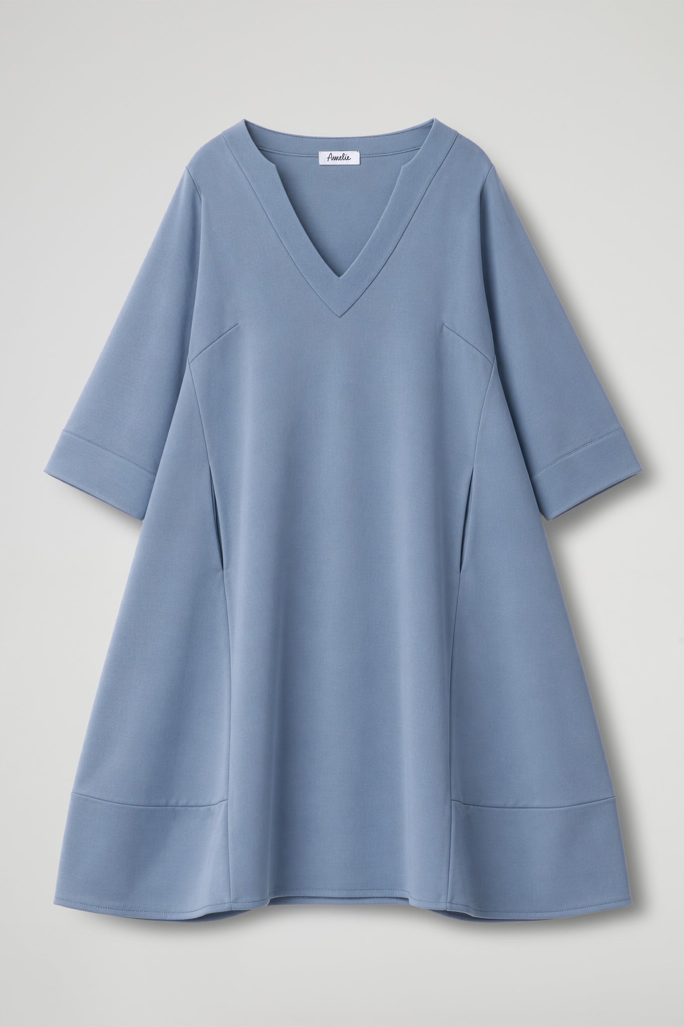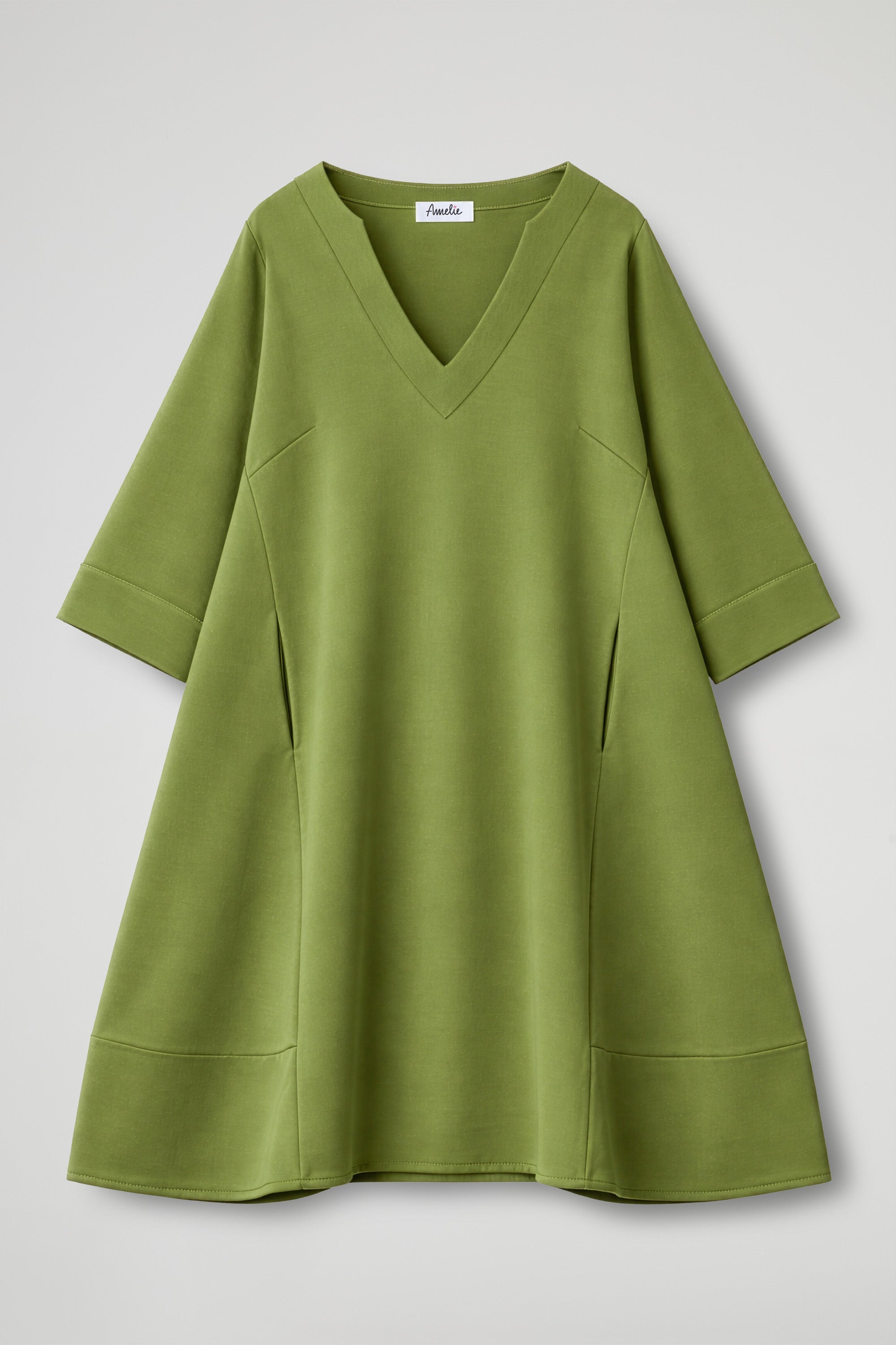 Abito in tessuto fluido dalla mano morbida, linea ampia e scivolata che valorizza la silhouette senza costringerla, offrendo una vestibilità confortevole e versatile. Lo scollo a V profondo a contrasto colore incornicia il décolleté con pulizia, aggiungendo un tocco di essenzialità sofisticata; Le maniche a tre quarti, dal taglio rilassato, sono completate da risvolti sul fondo a contrasto colore che donano un dettaglio sartoriale ricercato. La costruzione del capo è arricchita da tagli laterali funzionali.