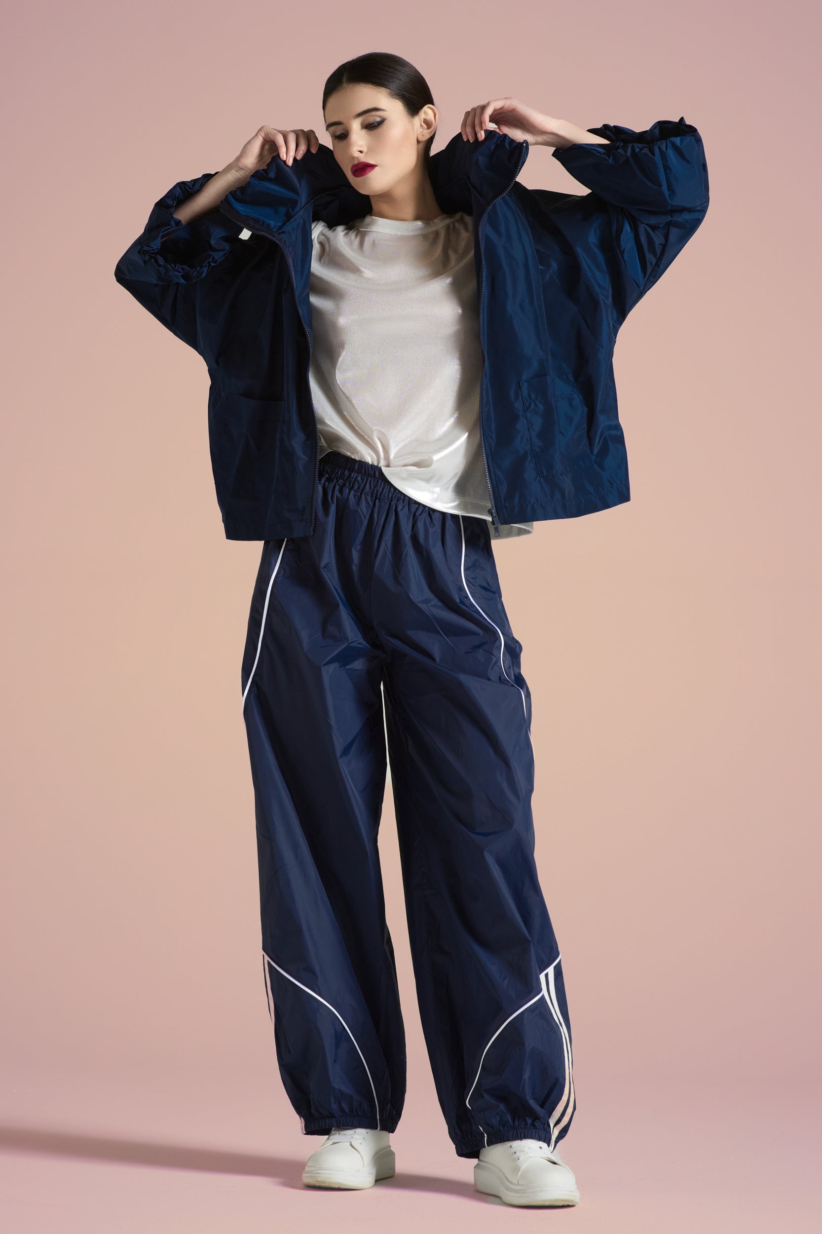 Giacca in tessuto tecnico , leggera e protettiva, dalla mano liscia e dall’aspetto lucido. Modello a volume ampio con spalle scese, pensato per una vestibilità comoda e contemporanea.