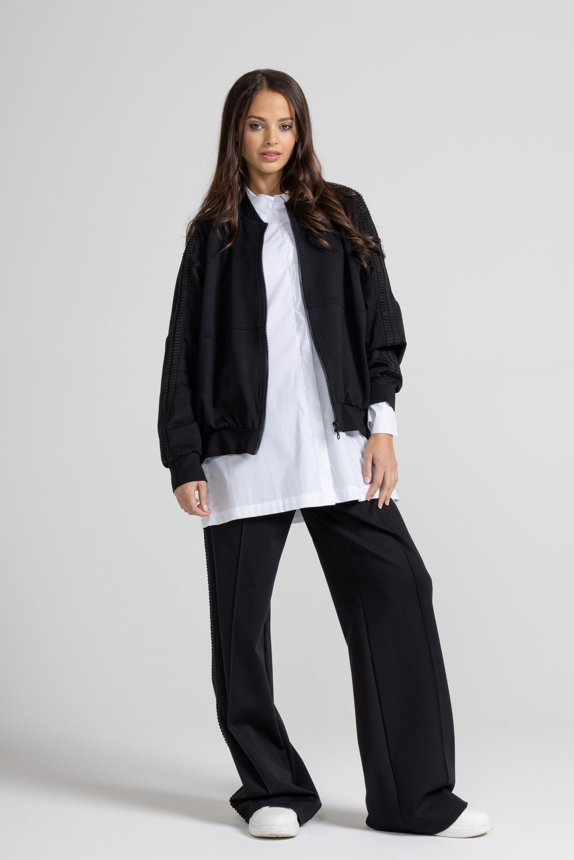 BOMBER IN PUNTO MILANO DI VISCOSA, DETTAGLIO TAGLIO CENTRALE RIBATTUTO, MANICA LUNGA, POLSO E FONDO RIBATTUTI ALTI, DETTAGLIO PASSAMANERIA SU LUNGHEZZA MANICA.