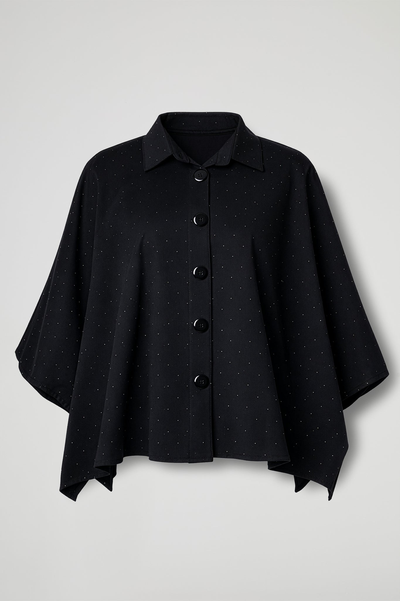 Mantella corta dal taglio over e super femminile, impreziosita da una raffinata micro puntinatura luminosa di strass; Il taglio ampio e fluido scivola sul corpo con naturalezza, mentre le maniche kimono e il fondo a punta creano un movimento elegante ad ogni passo.