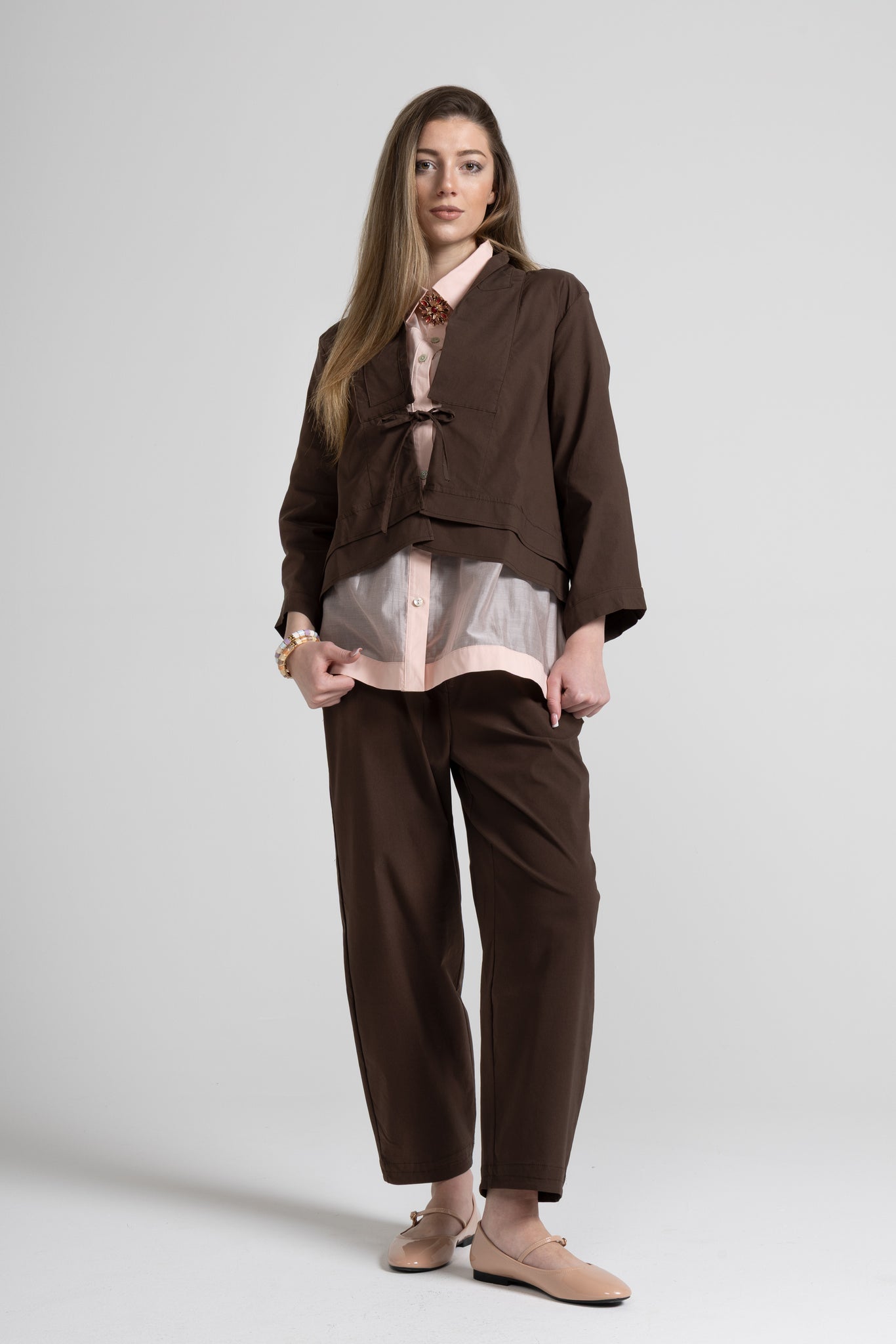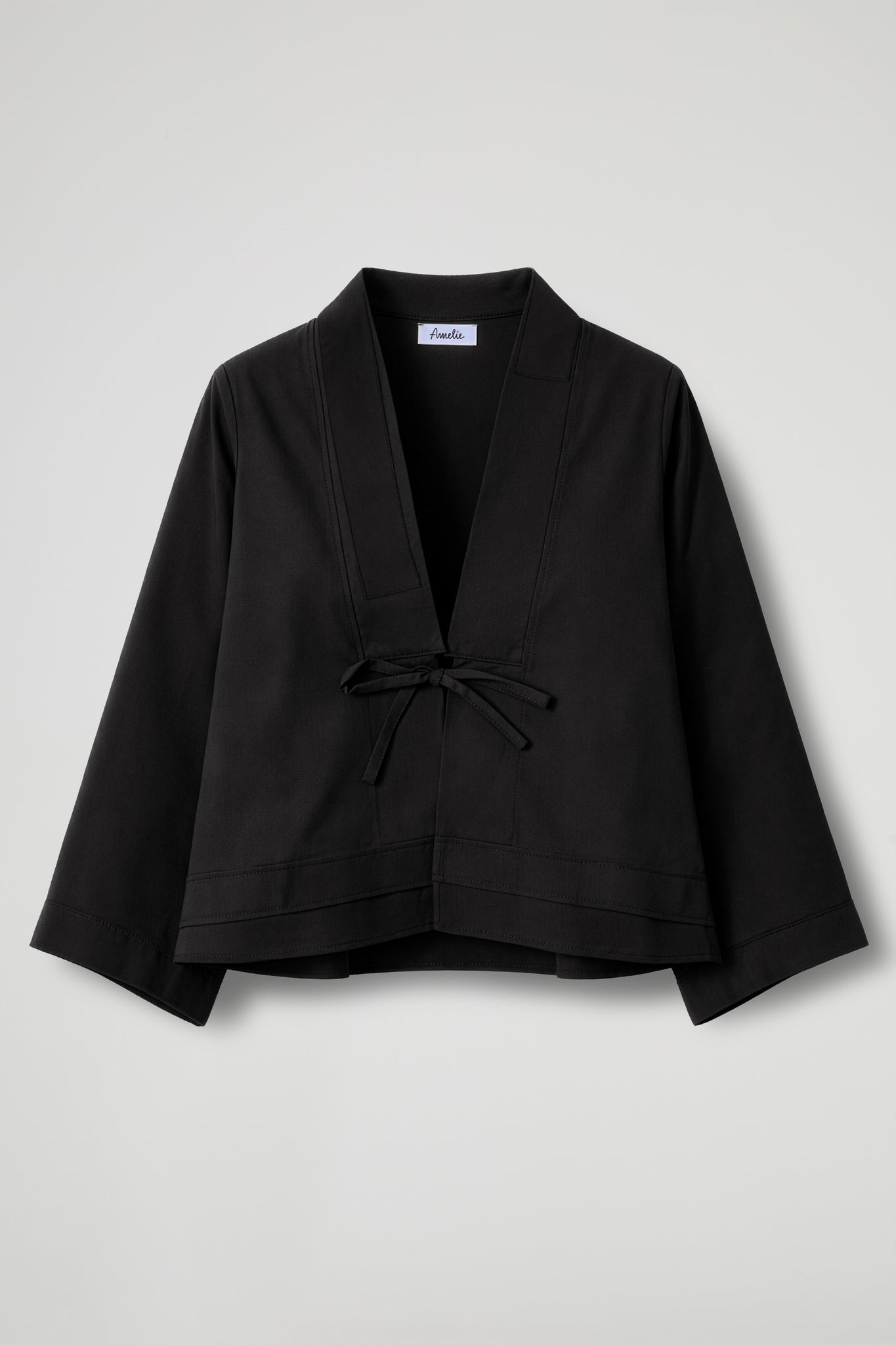 Giacca corta dal taglio pulito e moderno, veste con leggerezza e definisce la silhouette grazie alla chiusura con laccetti sul davanti. Lo scollo a V con rever essenziale slancia il décolleté, mentre le maniche ampie aggiungono un twist contemporaneo e super chic.