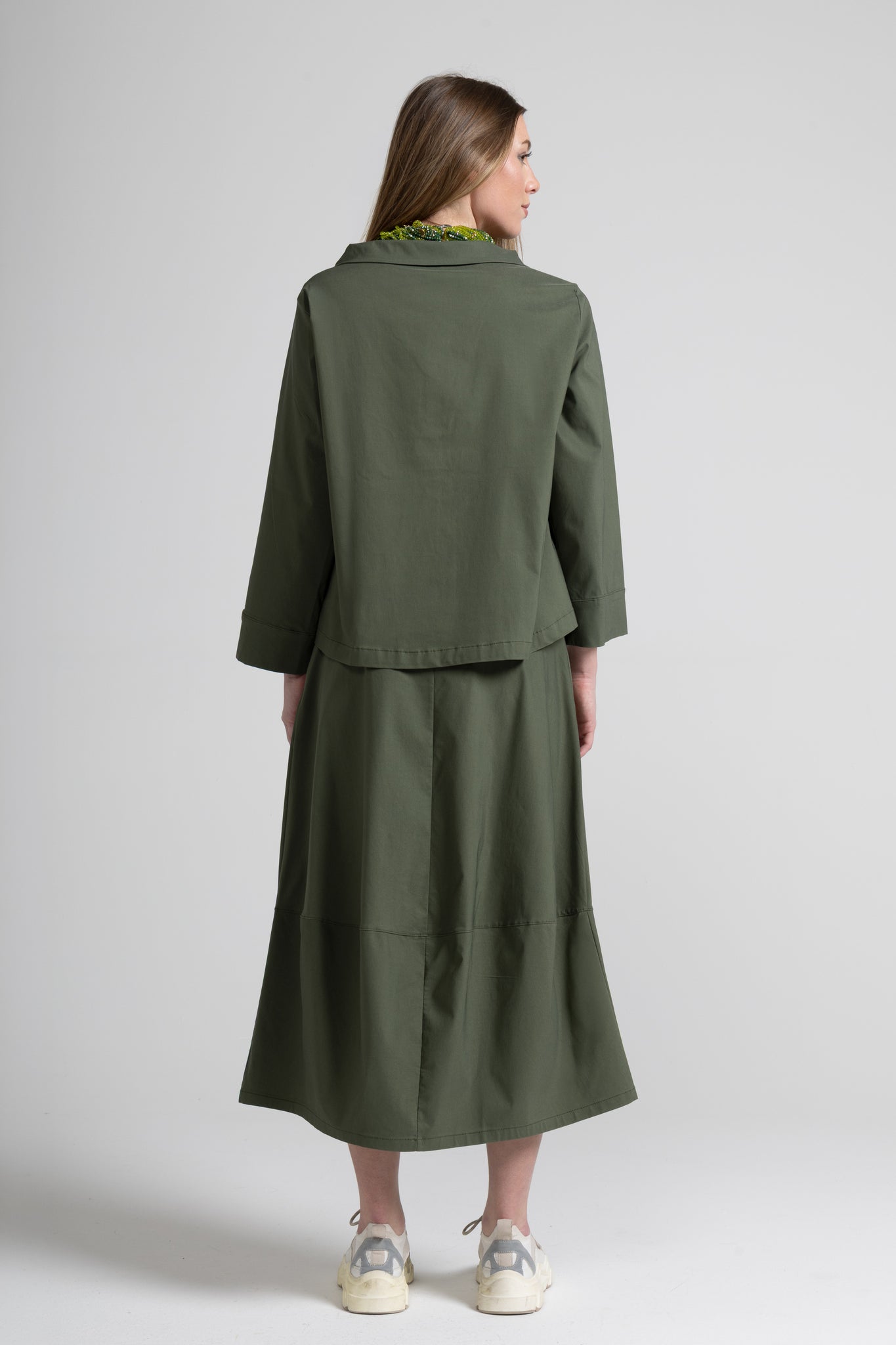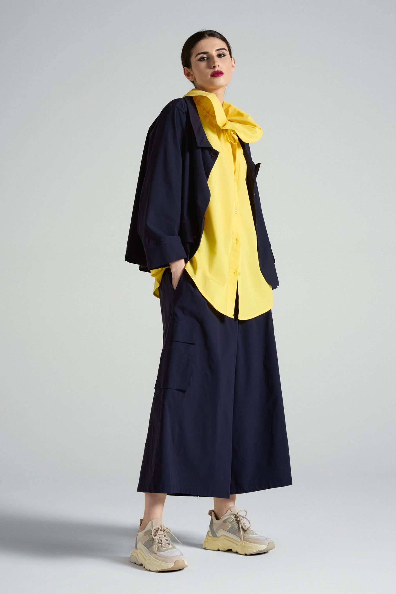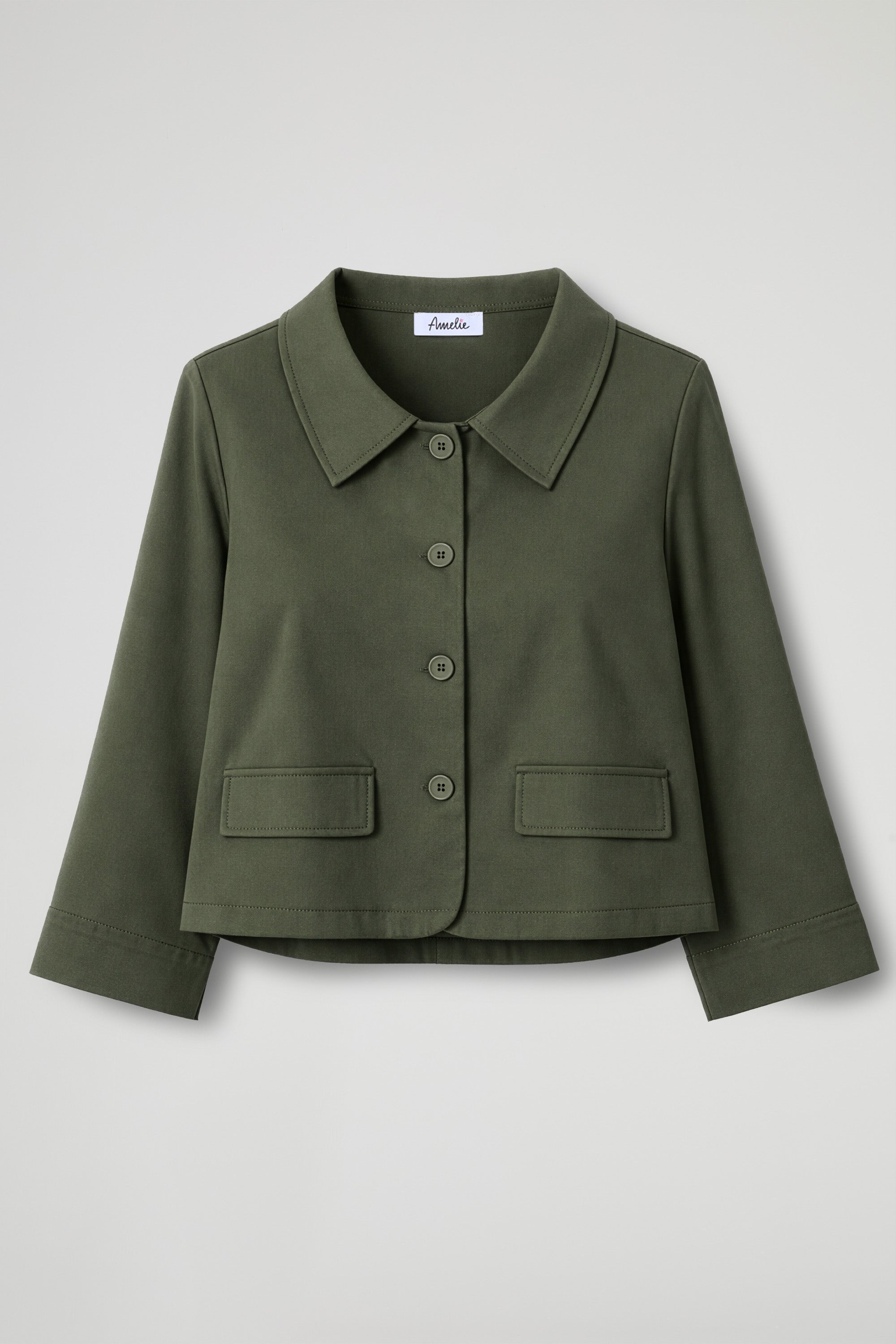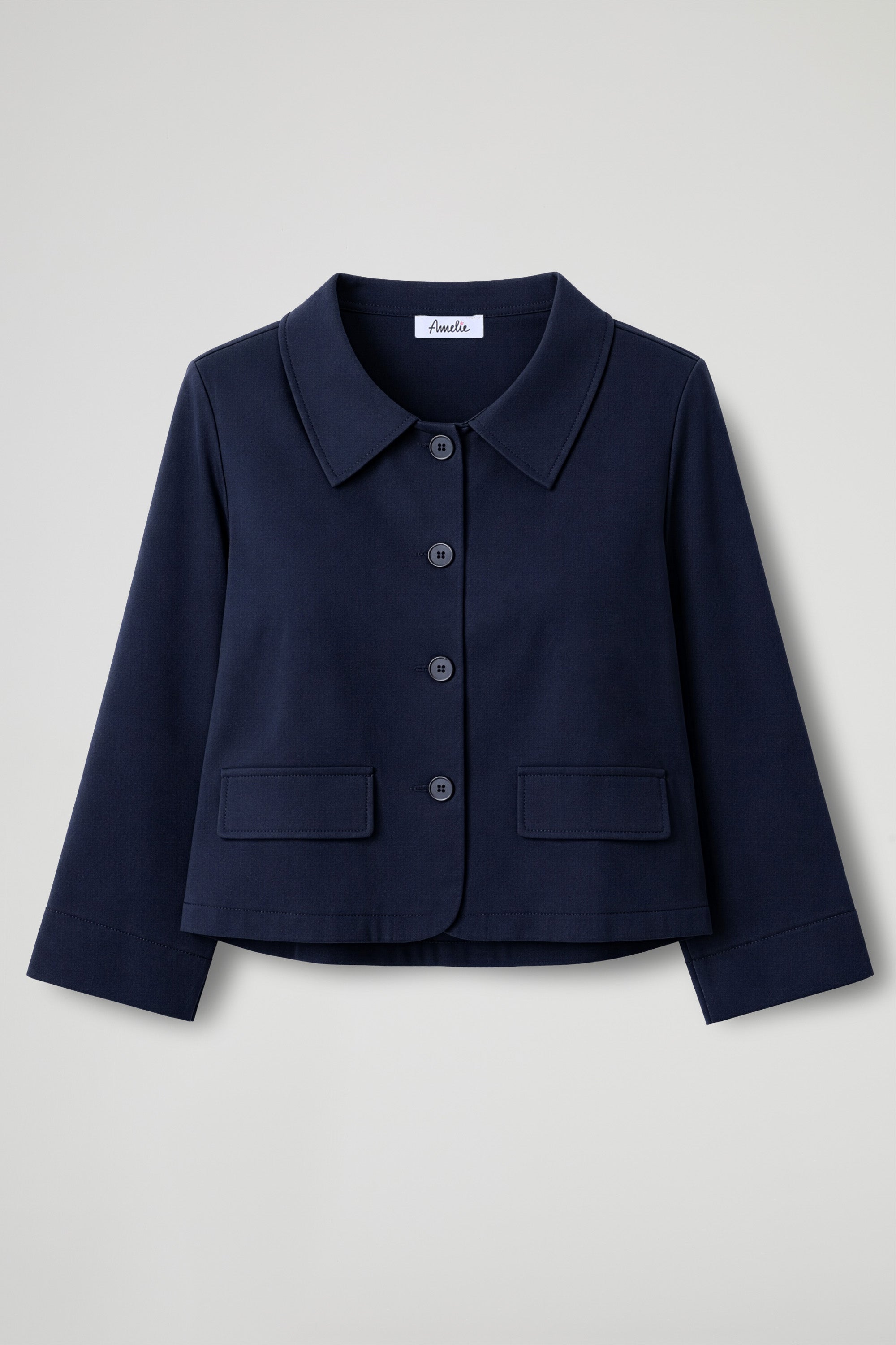 Giacca corta dal taglio boxy e pulito, pensata per dare struttura al look senza appesantire. Il colletto a camicia e l’abbottonatura frontale la rendono essenziale ma super versatile: perfetta su pantaloni a vita alta, denim o abiti, dal giorno alla sera.