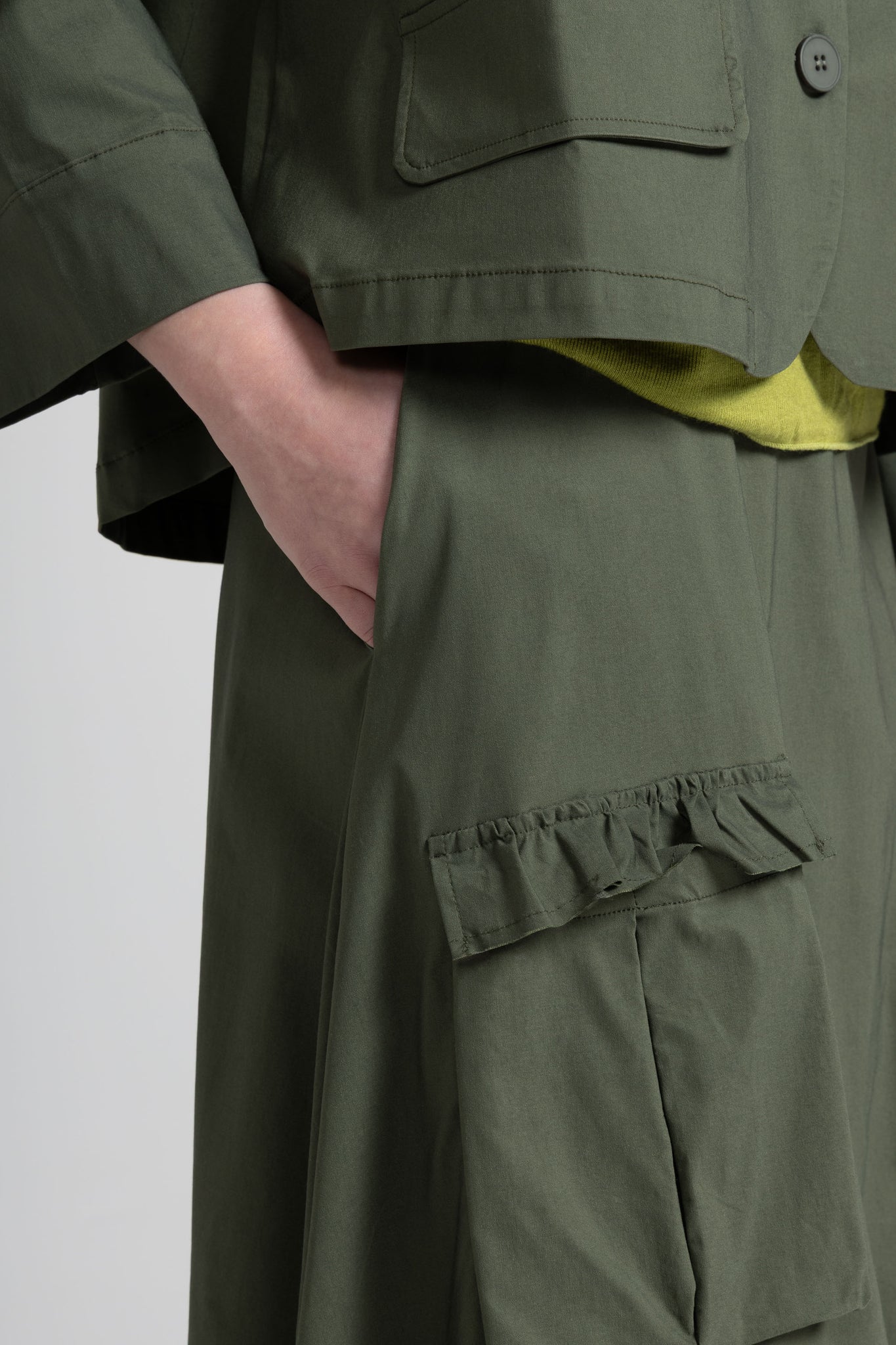 Giacca corta taglio boxy leggermente asimmetrica in tessuto di viscosa, colletto a camicia, manica lunga, chisura frontale con bottoni, due tasche applicate con pattina. Linea confortevole