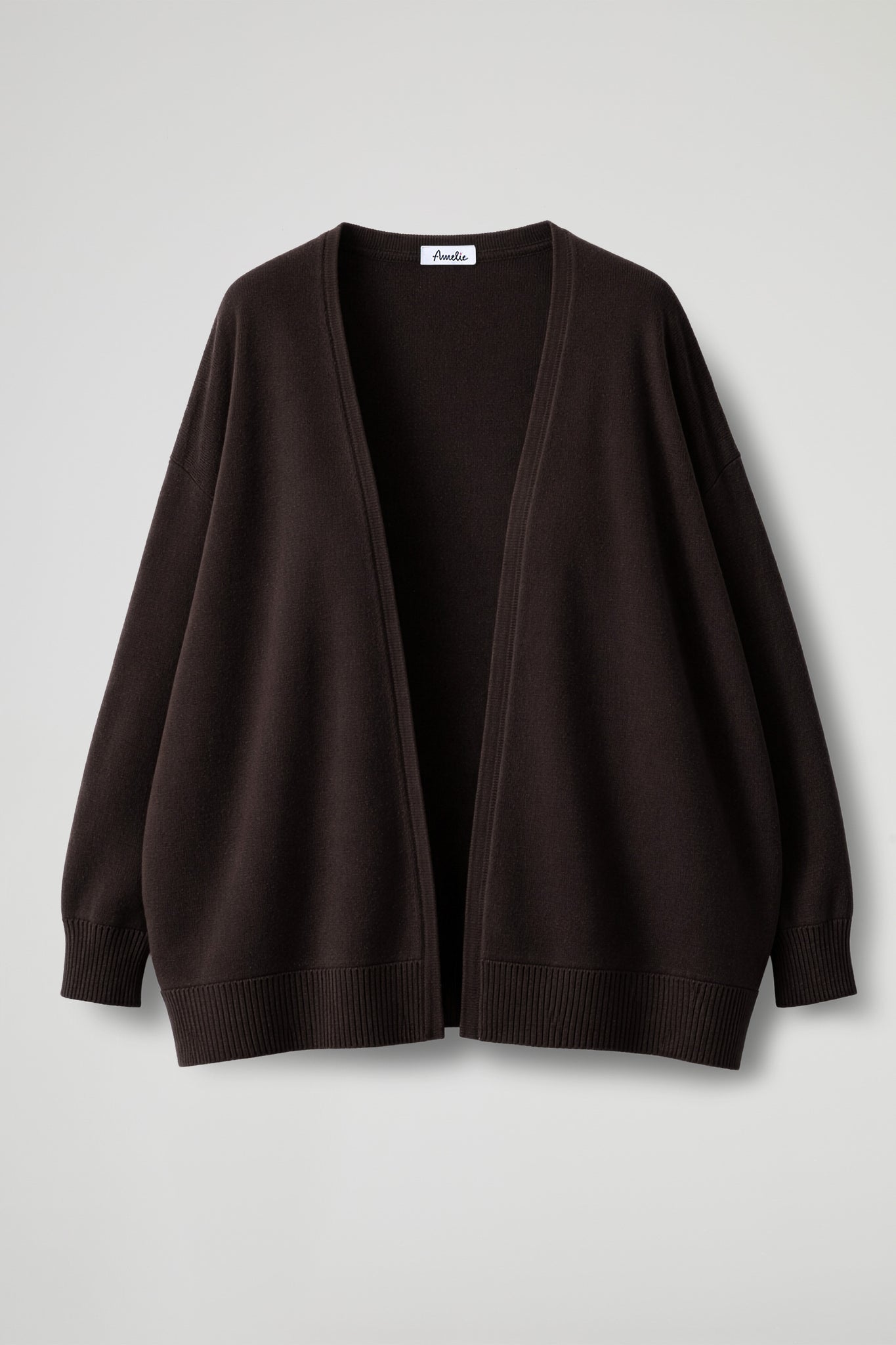 Cardigan  Over, apertura frontale senza bottoni con bordo rifinito con lavorazione pulita e lineare, spalle scese, manica lunga con polsino a coste, orlo ribattuto alto con dettaglio a coste. Linea ampia.