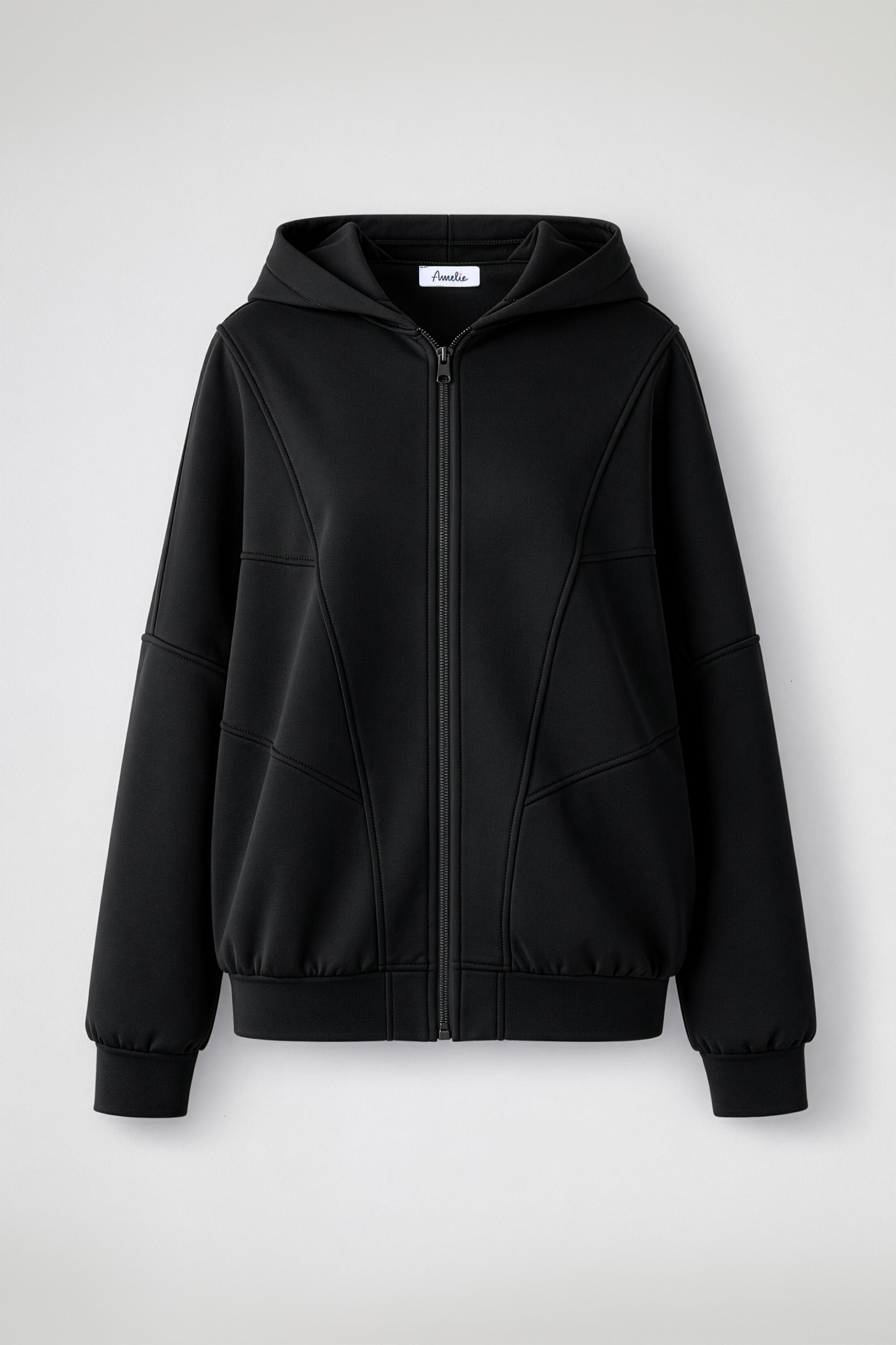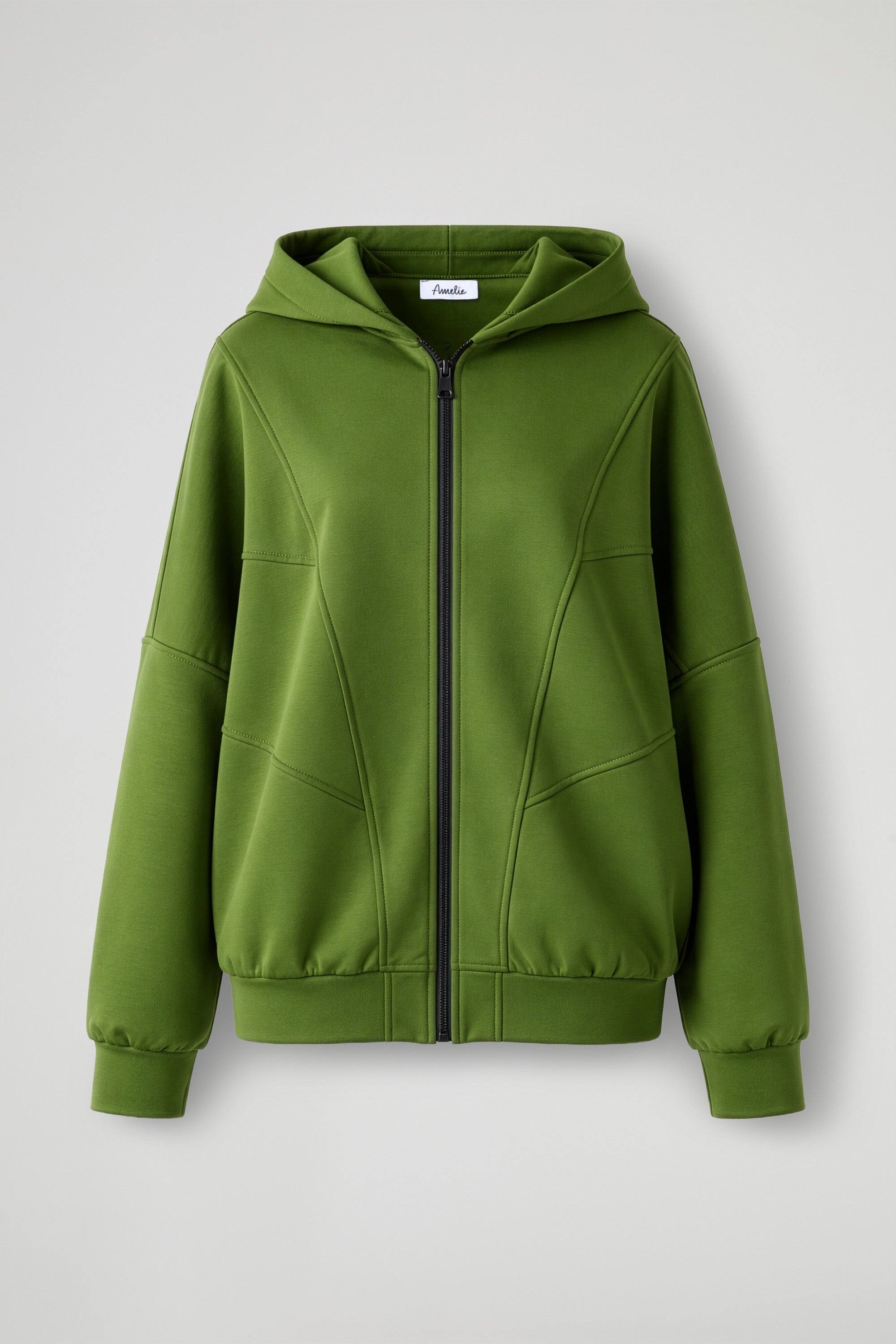 Felpa over, capo che unisce comfort, stile e versatilità; realizzata in tessuto di viscosa, morbido e compatto, piacevole al tatto; Il design è arricchito da tagli sartoriali che definiscono la silhouette e donano struttura al capo, mantenendo una vestibilità comoda e moderna. La chiusura frontale con zip rende la felpa pratica e funzionale, mentre il cappuccio ampio aggiunge un tocco sportivo e contemporaneo.