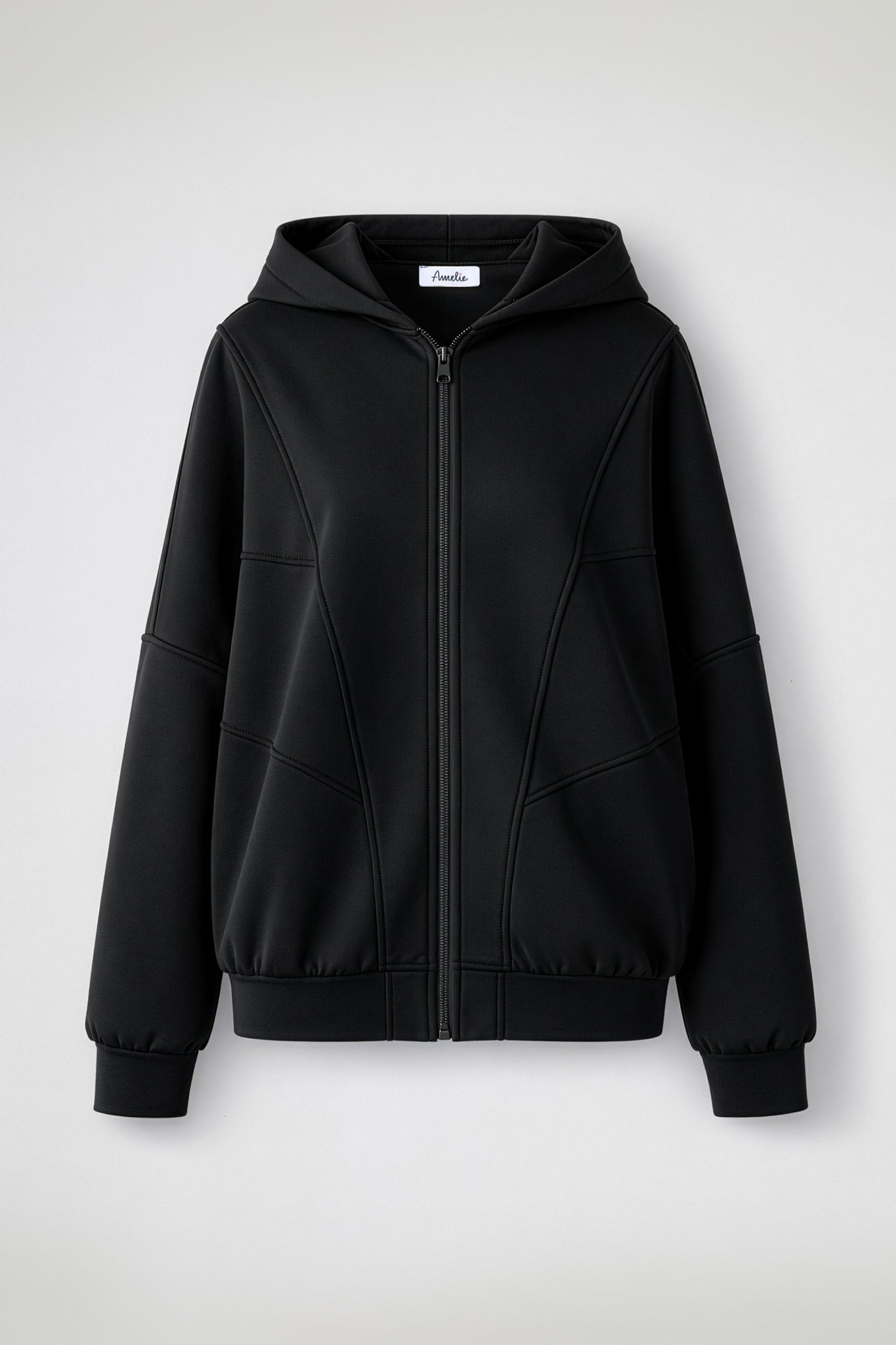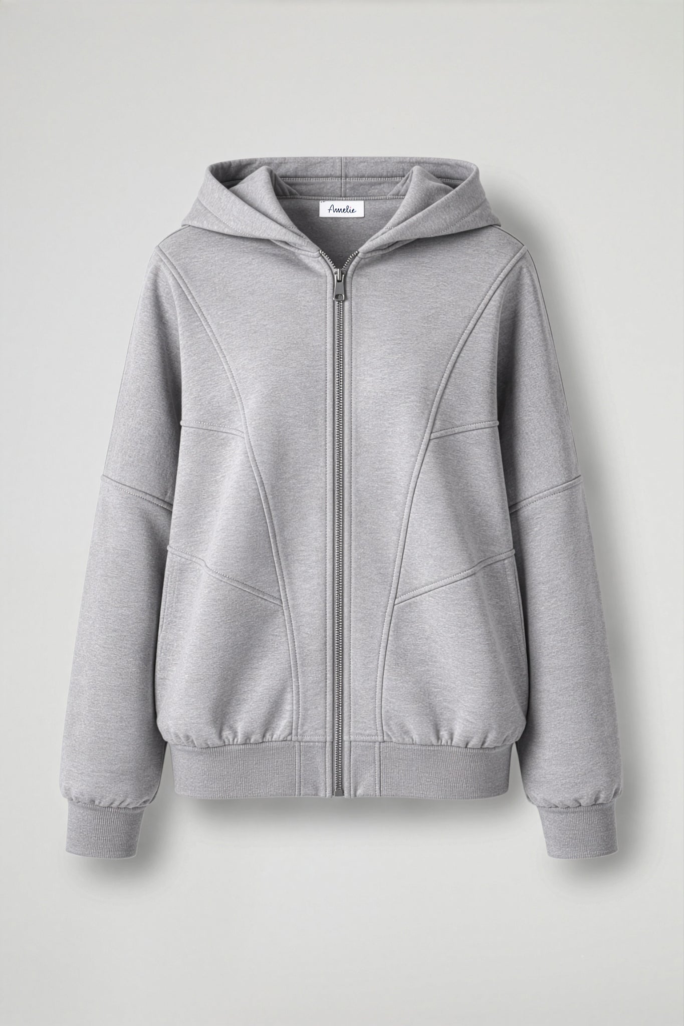 Felpa con cappuccio, spalla scesa, manica lunga con dettaglio polsino, chiusura frontale con zip nera dal doppio cursore, tagli e cuciture sartoriali decorativi , orlo alto sul fondo. Linea confortevole.