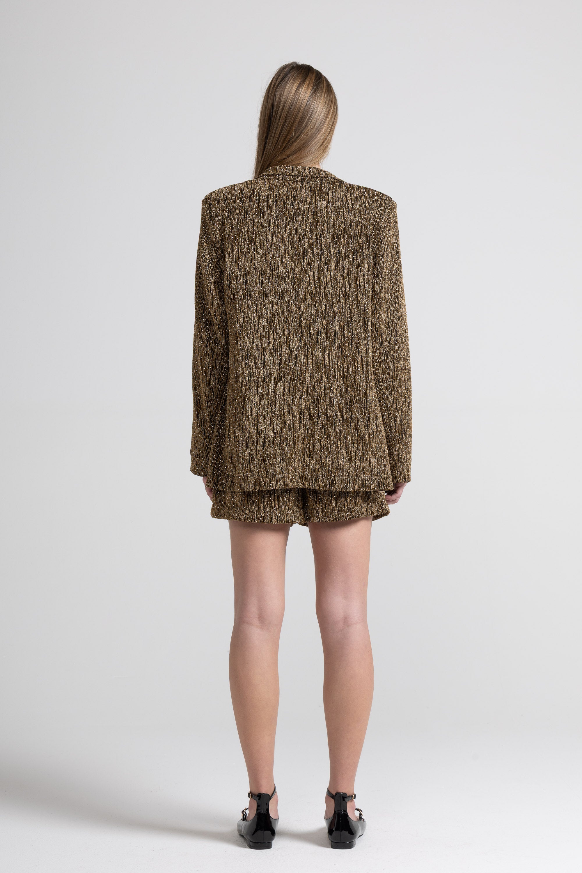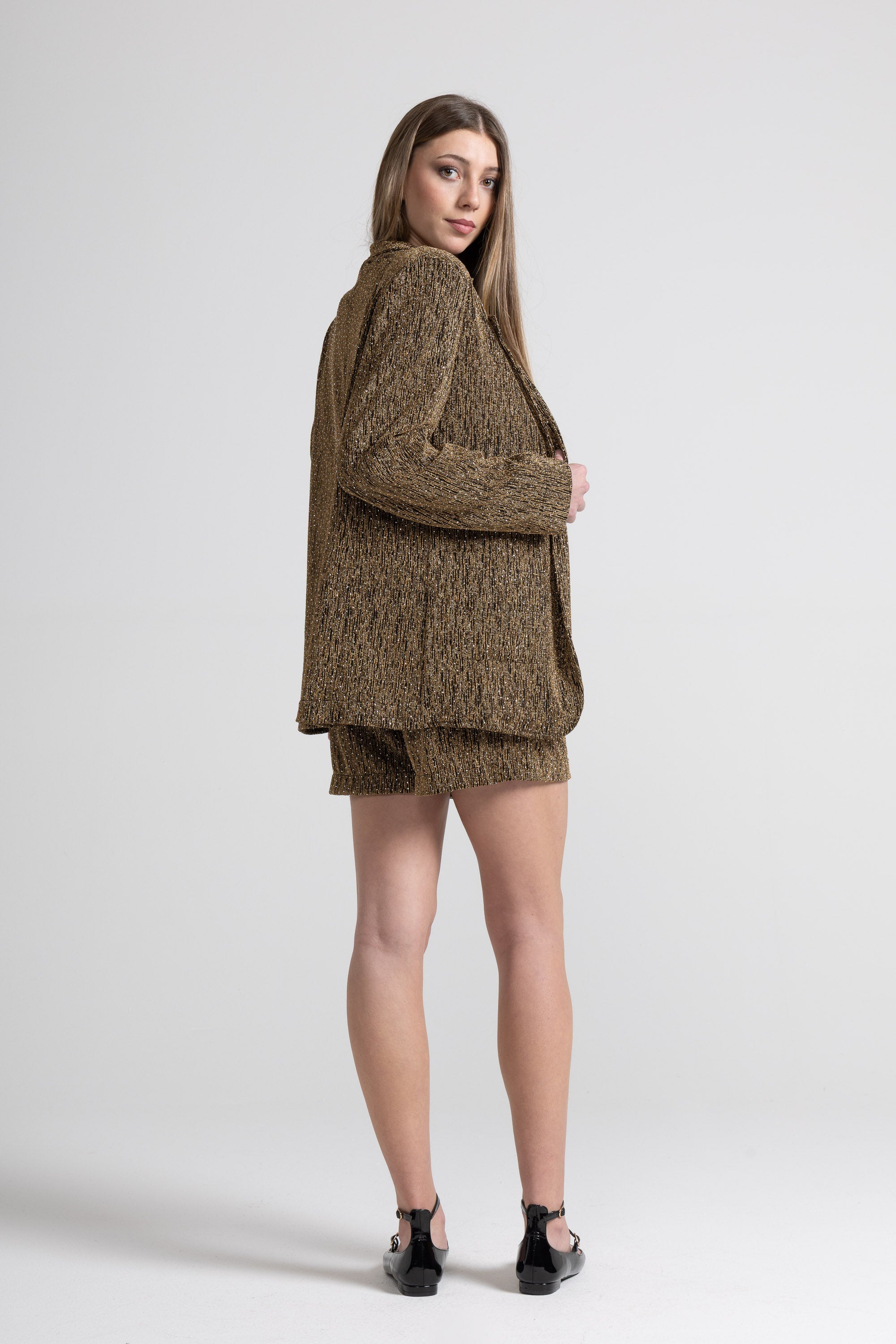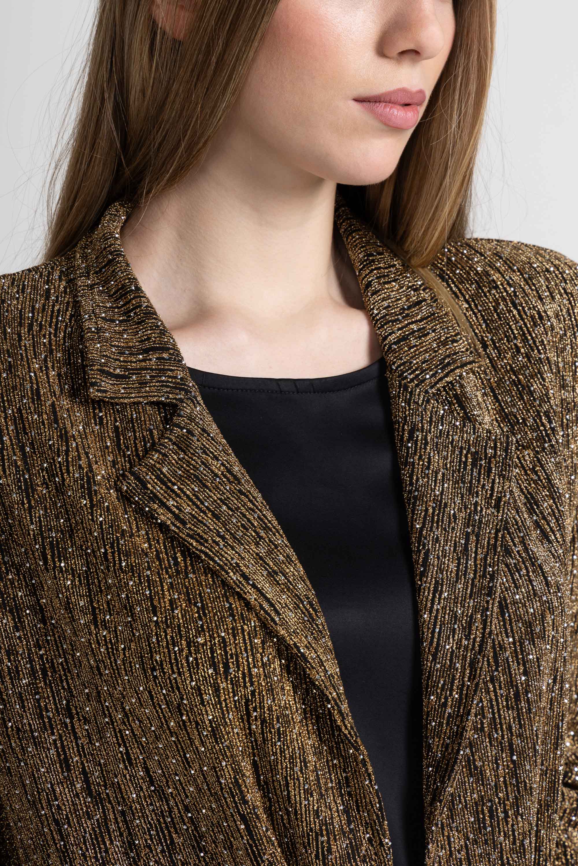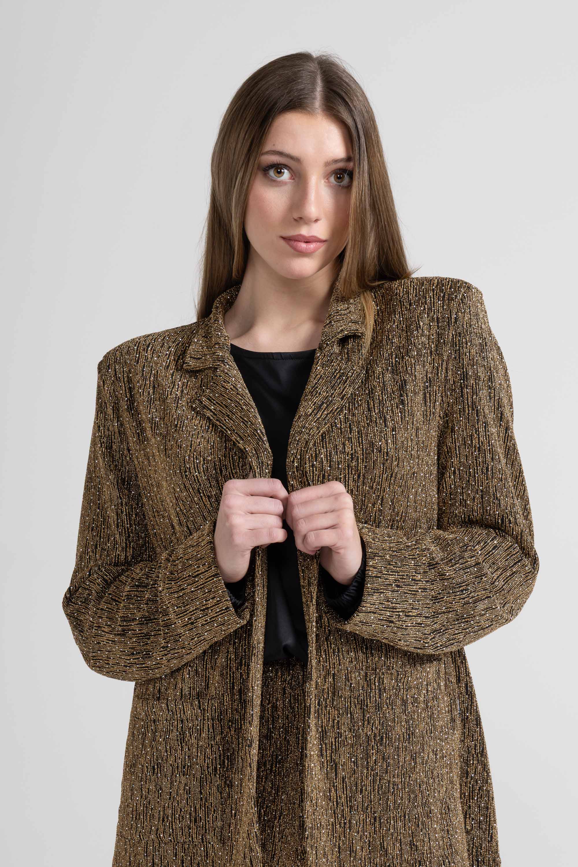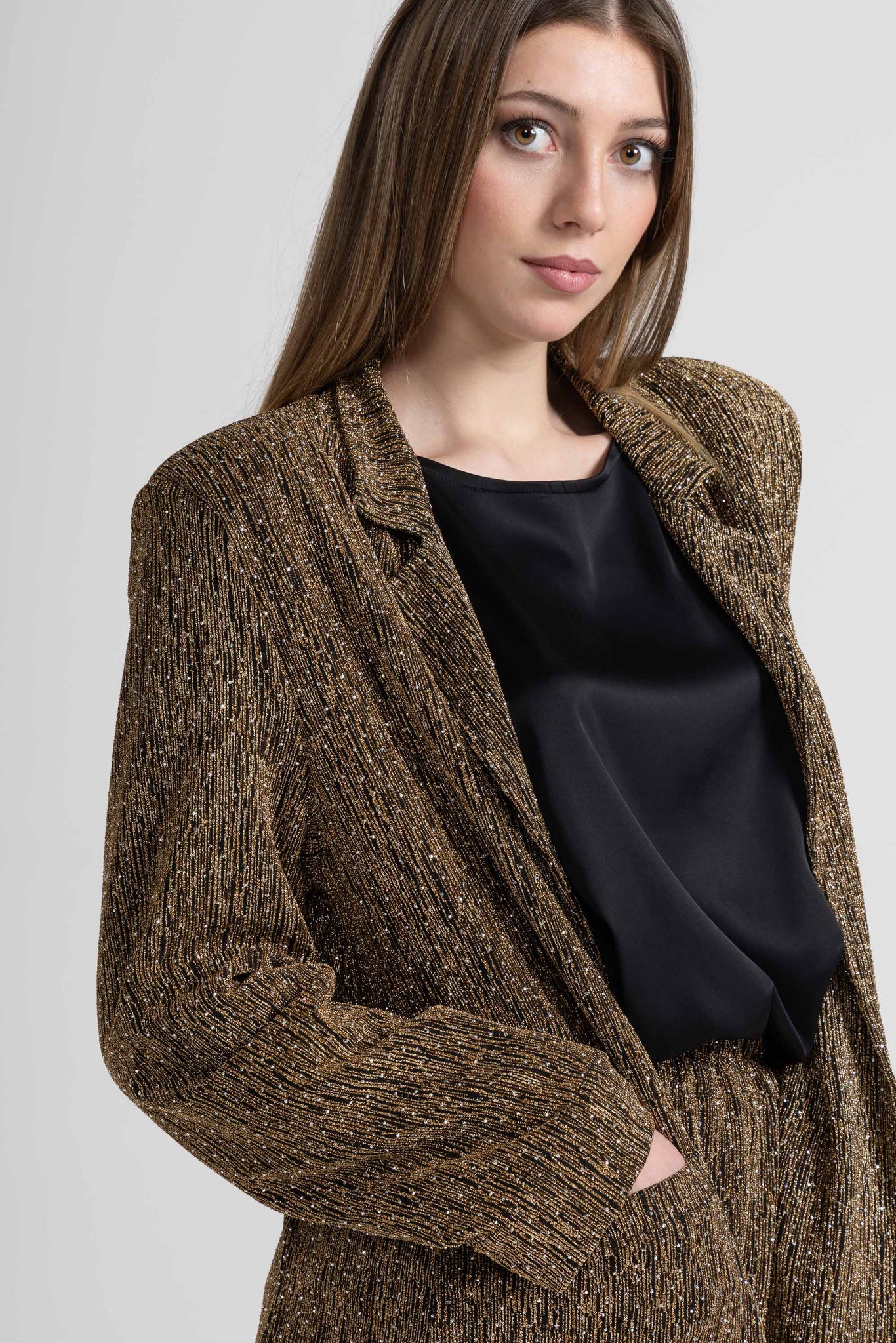 Giacca in lurex , un capo  che unisce eleganza e modernità in un design leggero e luminoso, perfetto per impreziosire un completo minimal, un abito da sera o un coordinato in lurex; è il capo ideale per brillare con discrezione e stile.