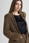 Giacca elasticizzata con filato lurex, collo a revers classico, spalline imbottite, manica lunga con orlo ribattuto alto, apertura senza bottoni, tasche frontali applicate. Linea morbida