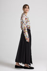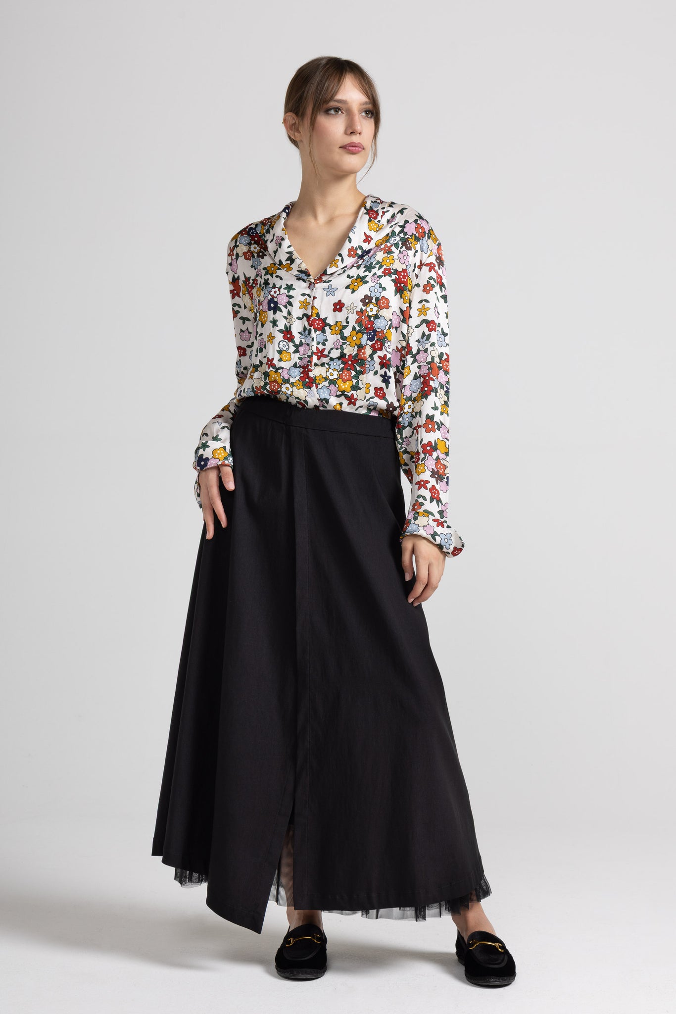 Gonna lunga a portafoglio in tessuto bengalina di viscosa elasticizzato, elastico in vita, sottogonna con dettaglio tulle sul fondo.