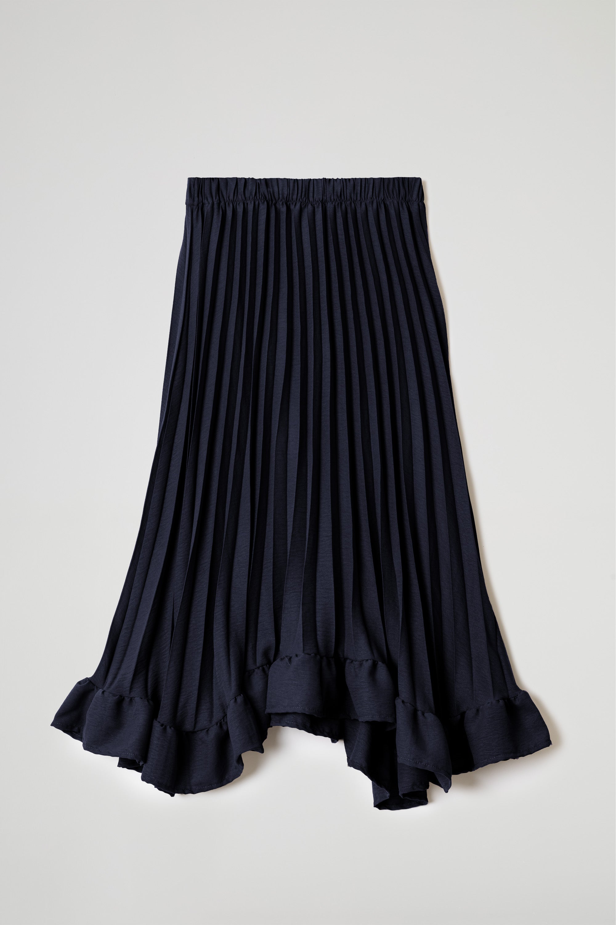 Gonna midi, elastico morbido in vita, plissè permanente su tutto il capo, orlo asimmetrico con balza arricciata
