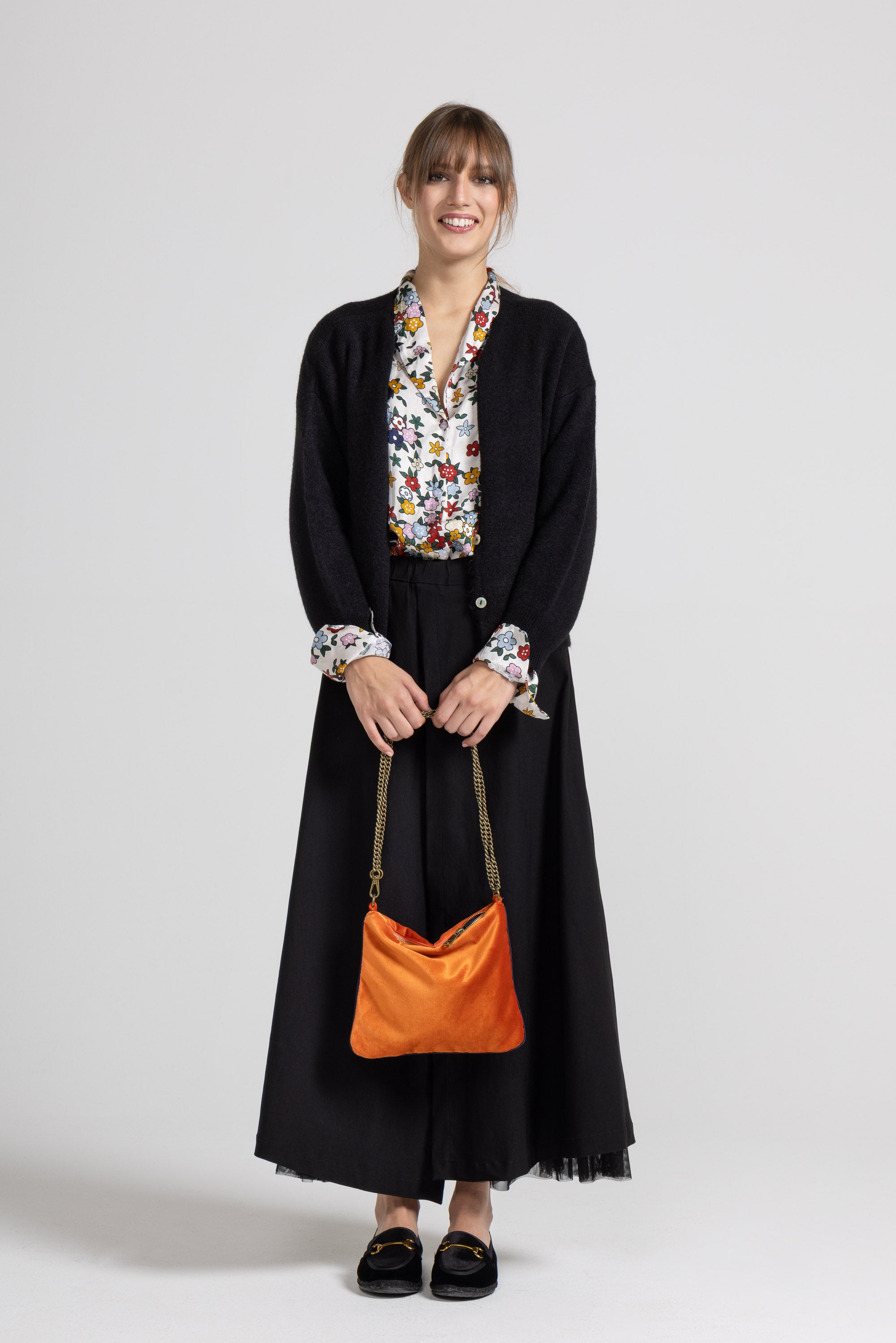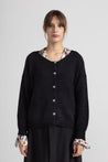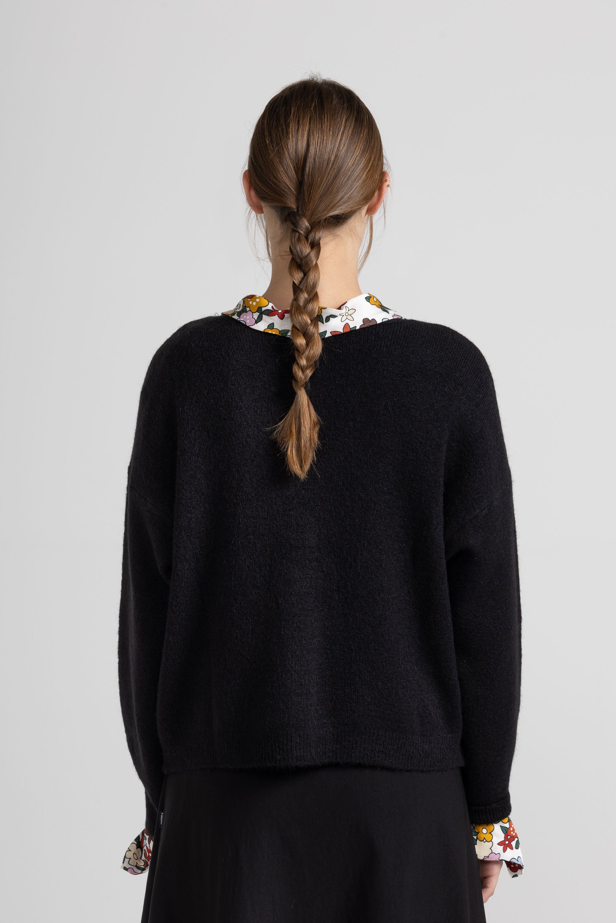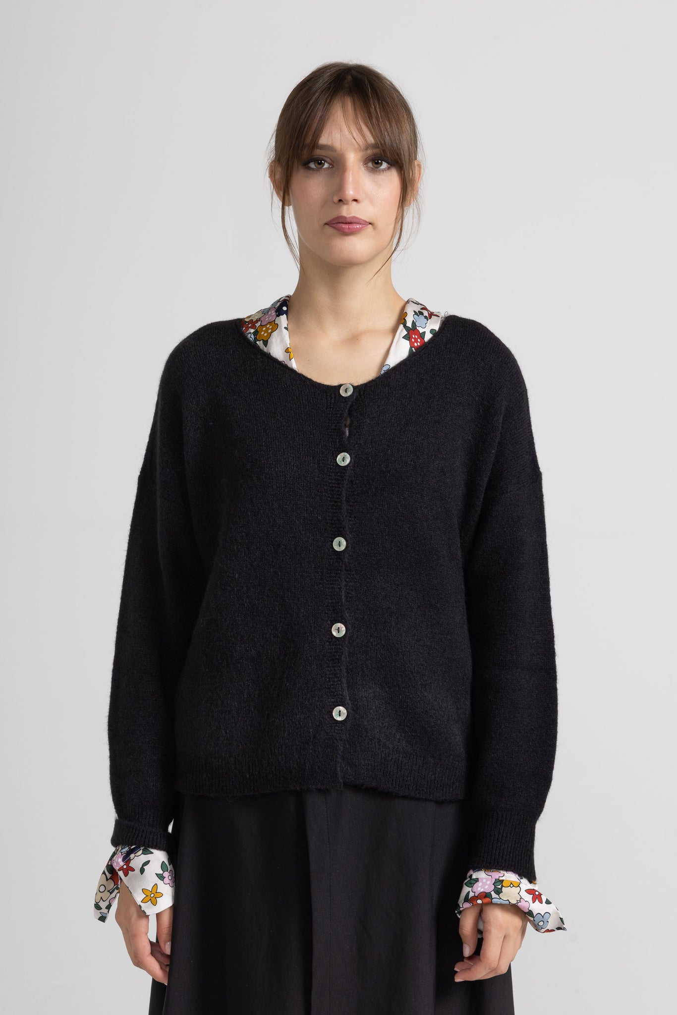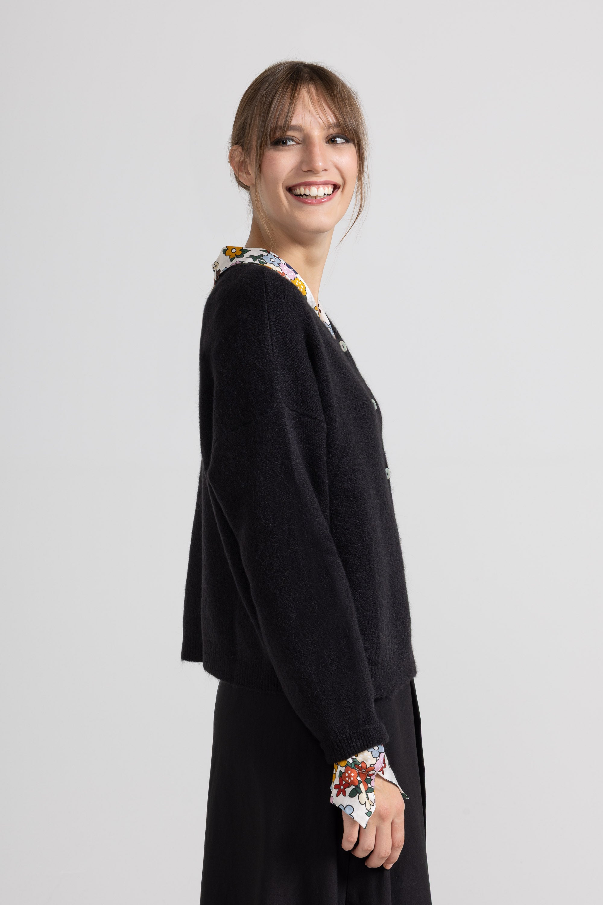 Cardigan in filato di alpaca, manica lunga, scollo a V, dettaglio coste su fondo e su polso, linea boxy, chiusura con bottoni madreperla.