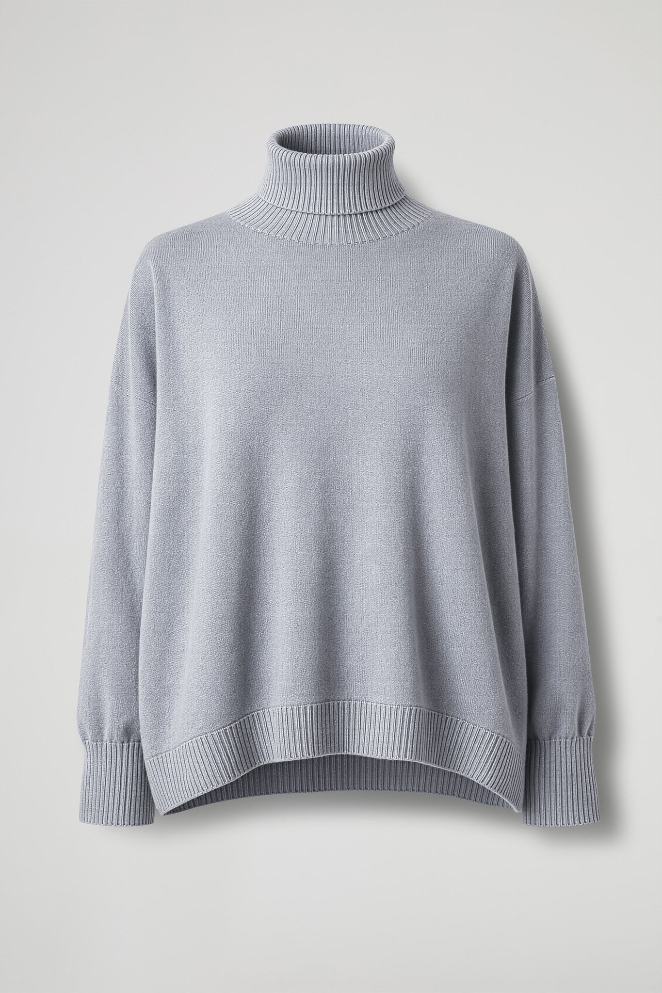 Collo alto e avvolgente a coste elasticizzate, spalle scese, maniche lunghe con polsino alto a coste elasticizzate, fondo asimmetrico e linea stondata con bordo alto a coste. Linea ampia