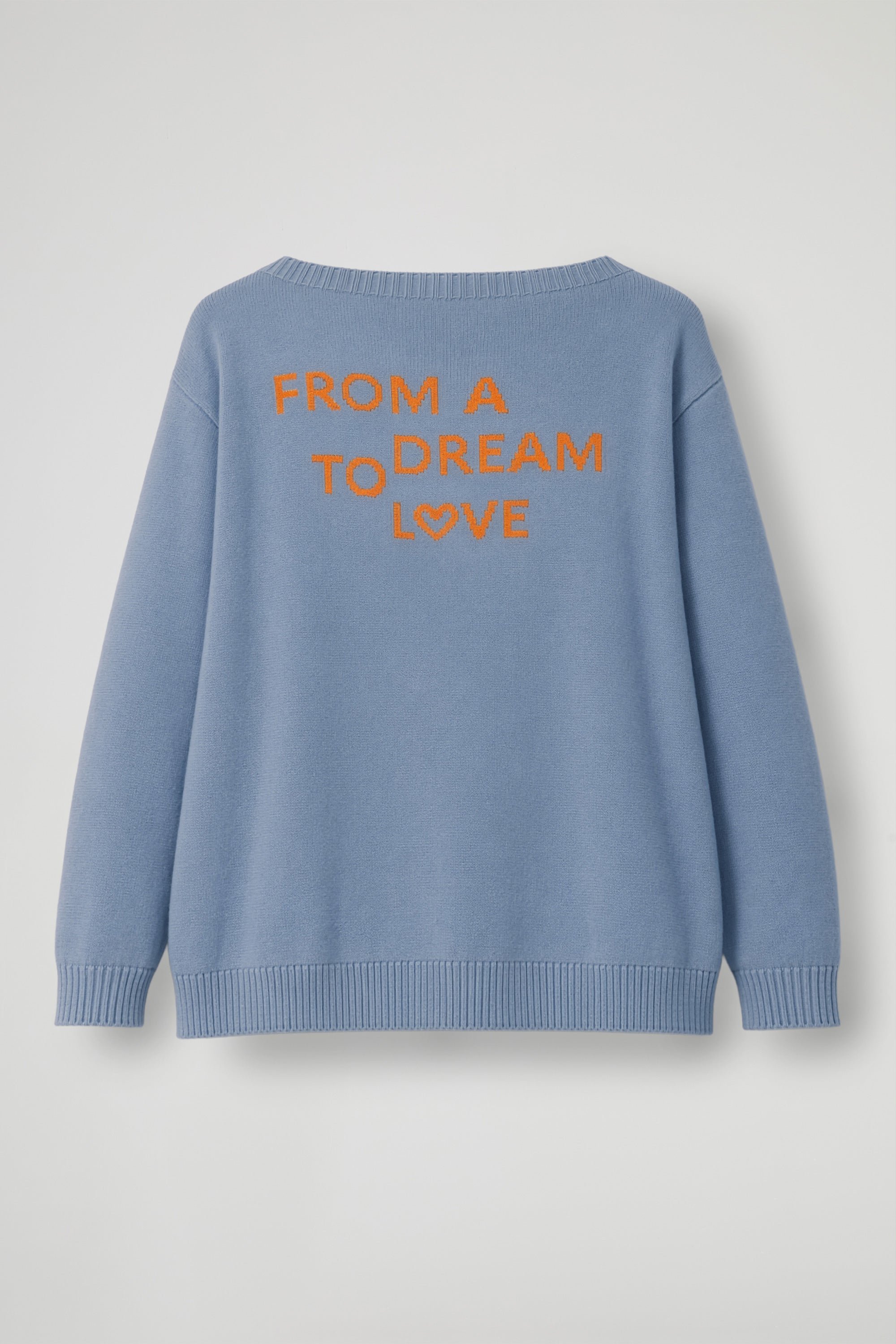 Maglia in morbido cotone dal design semplice ma con un tocco distintivo. Presenta una vestibilità comoda con spalle leggermente scese, scollo rotondo rifinito a costina e bordi elasticizzati su polsi e fondo per una migliore struttura; Sul retro è impreziosita dalla scritta a contrasto “FROM A DREAM LOVE” , dettaglio che dona personalità e un mood romantico e contemporaneo al capo.