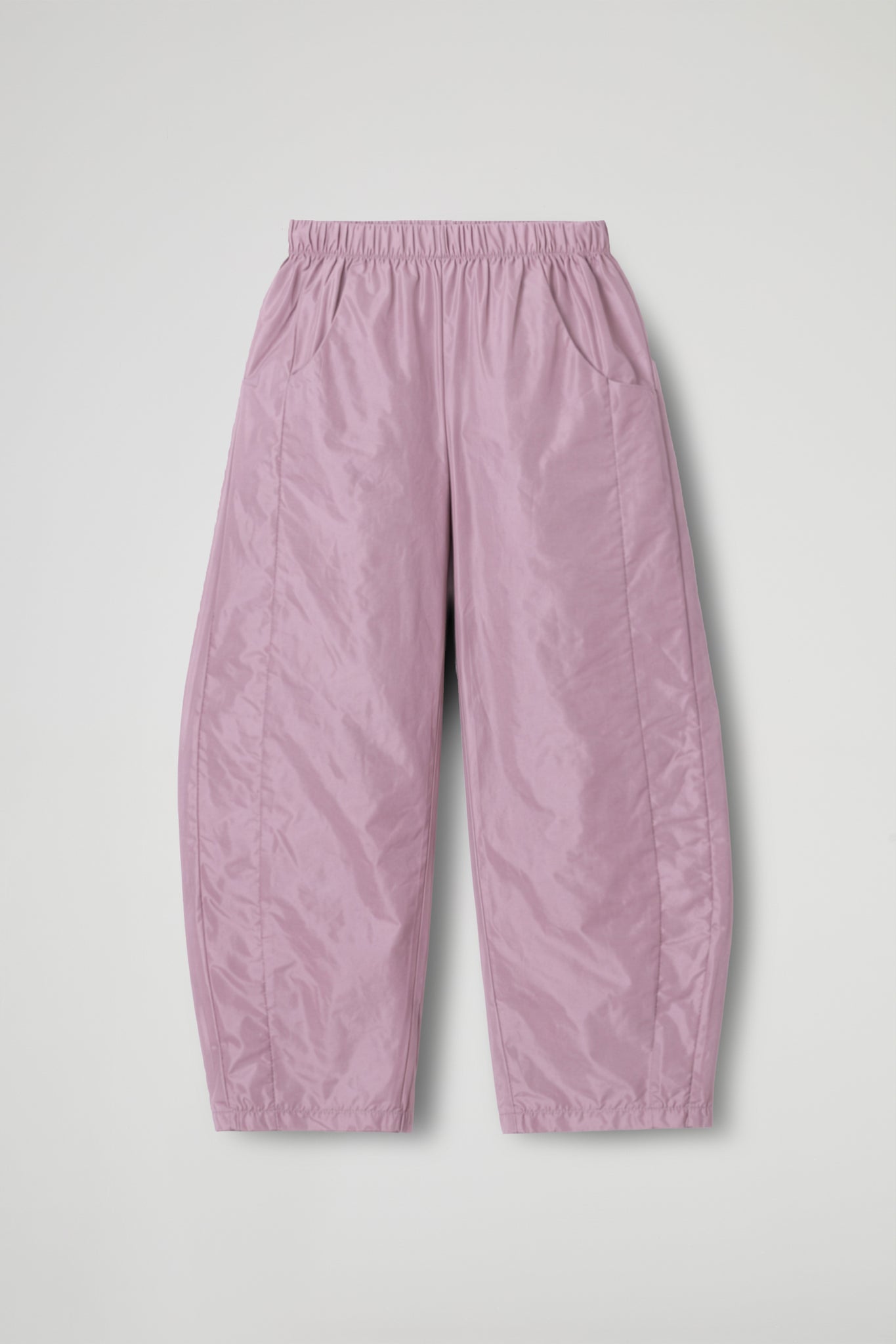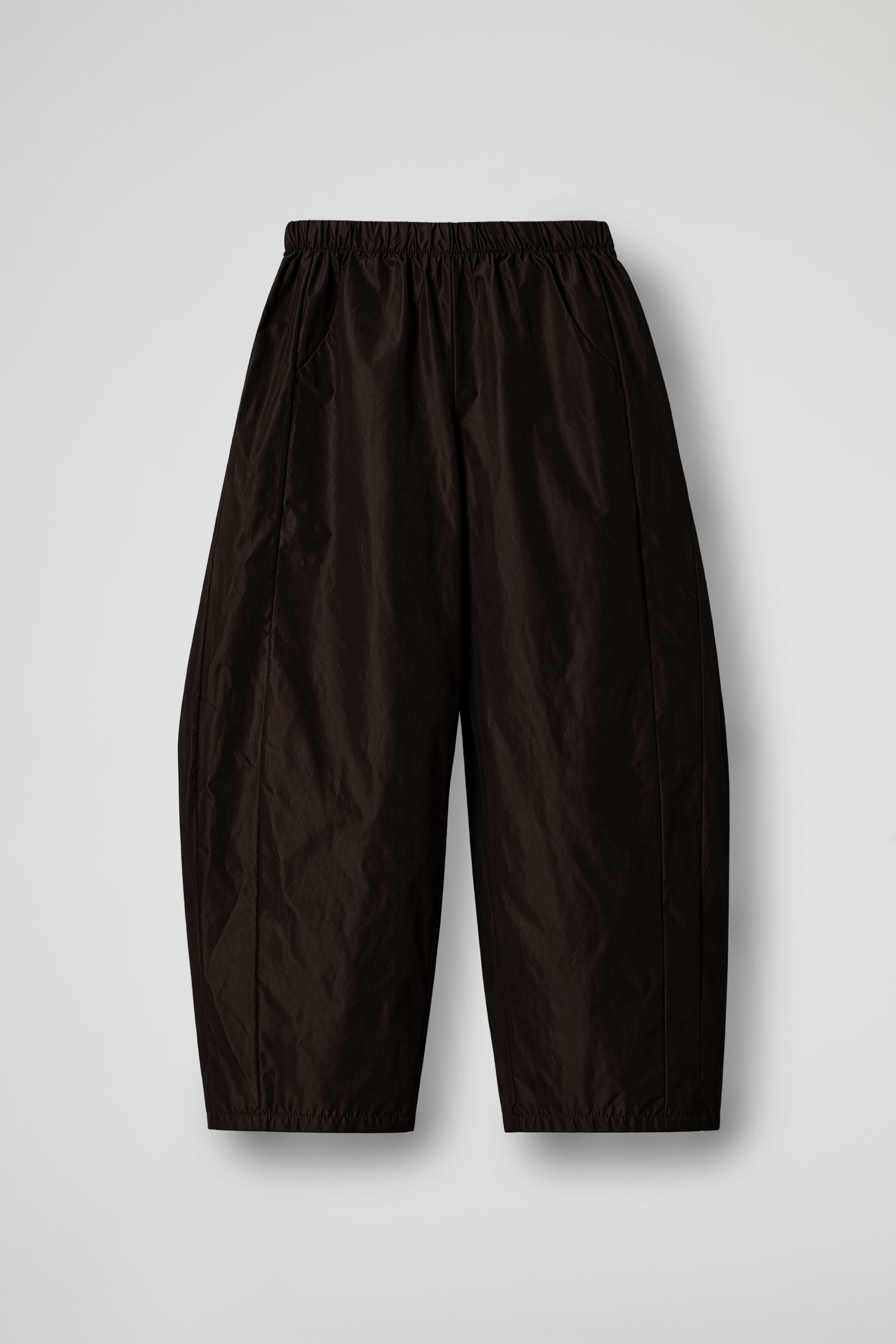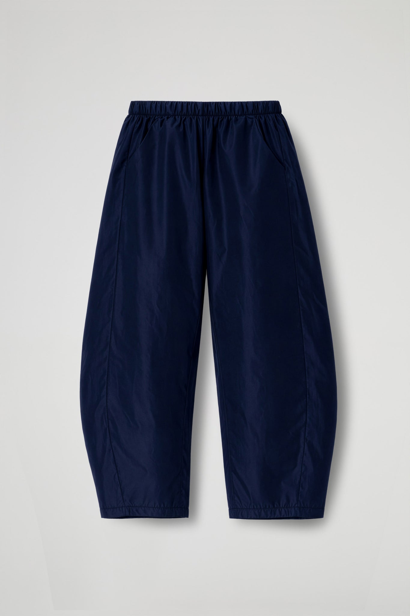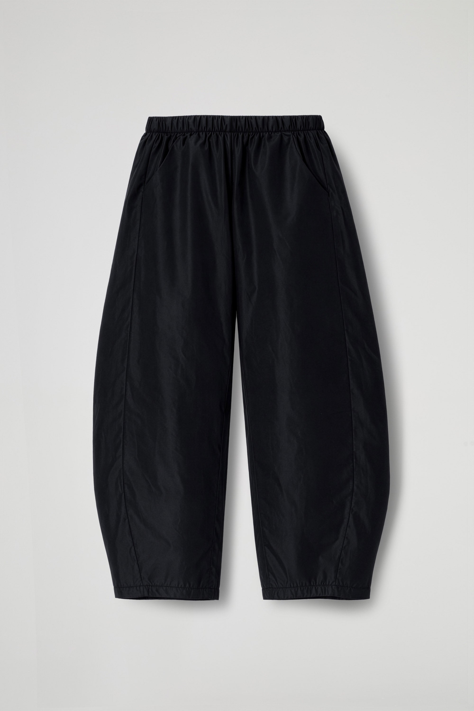 Pantaloni dal taglio balloon caratterizzati da una silhouette morbida e voluminosa lungo la gamba che si restringe progressivamente verso il fondo. La vita elasticizzata garantisce una vestibilità confortevole e adattabile, tasche laterali integrate nella cucitura e impunture verticali che valorizzando l’effetto “palloncino” senza appesantire la forma. Il fondo gamba è arricciato, dettaglio che completa la silhouette contemporanea.