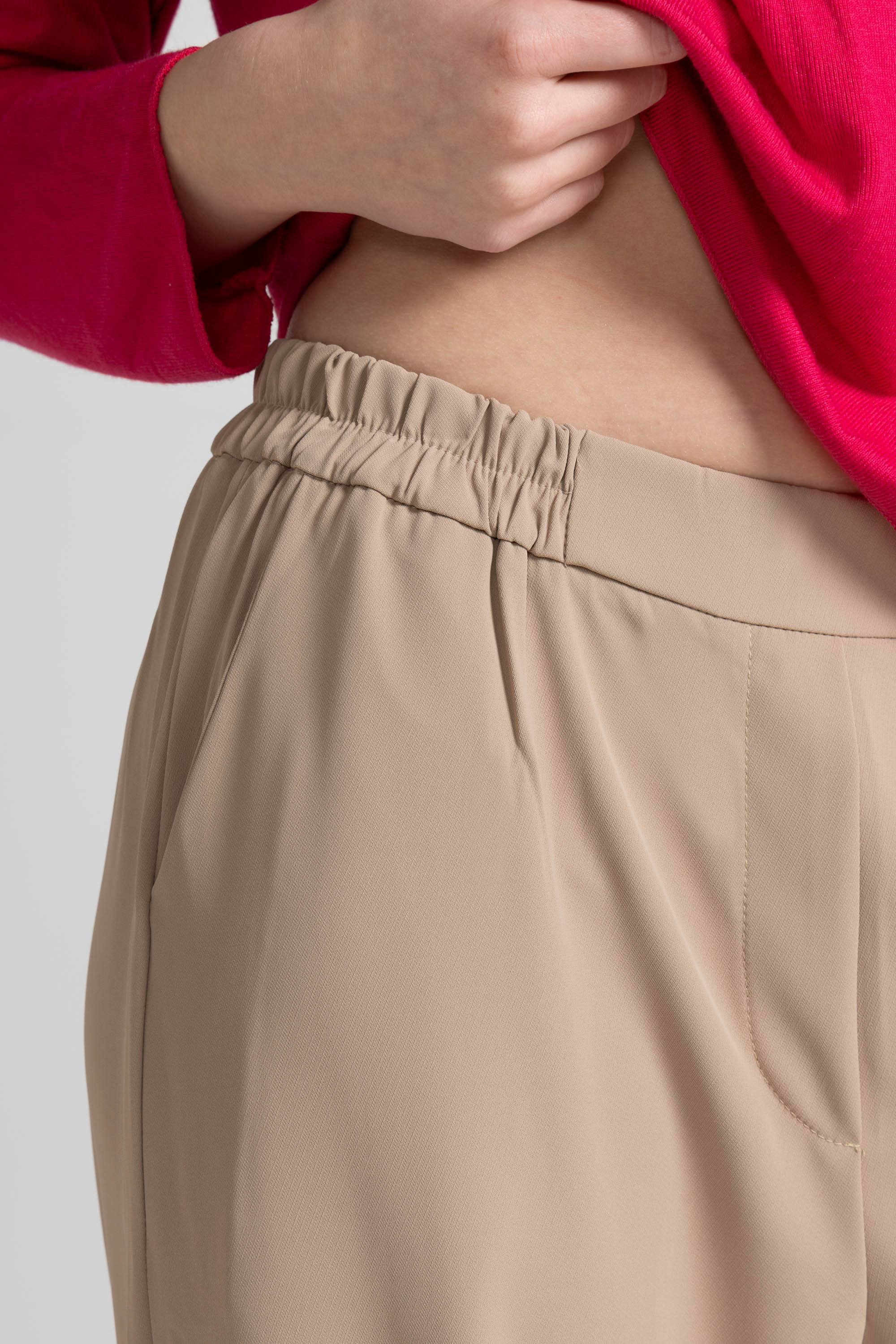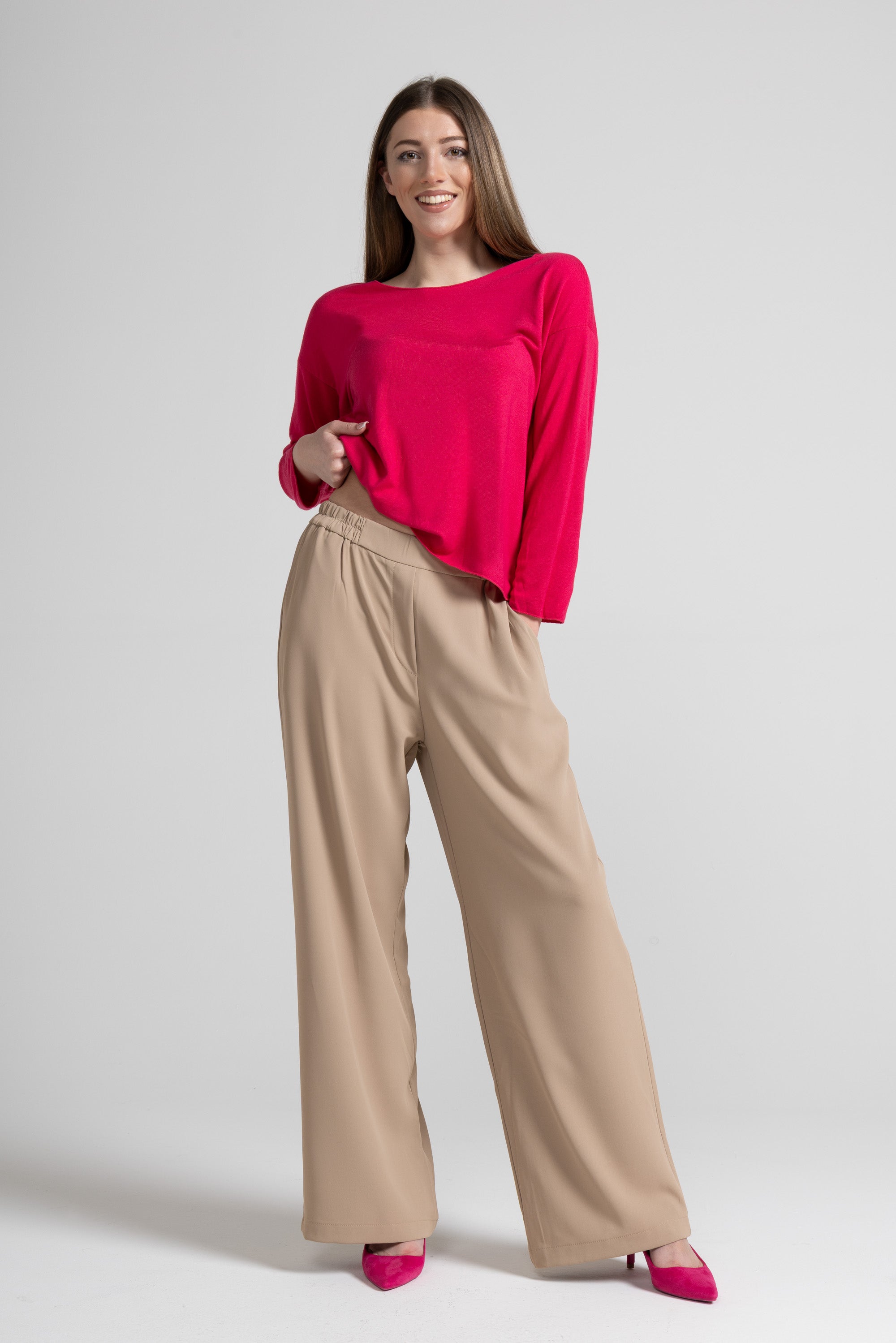 Pantalone a palazzo in tessuto fluido, vita elasticizzata, tasche alla americana. Linea ampia