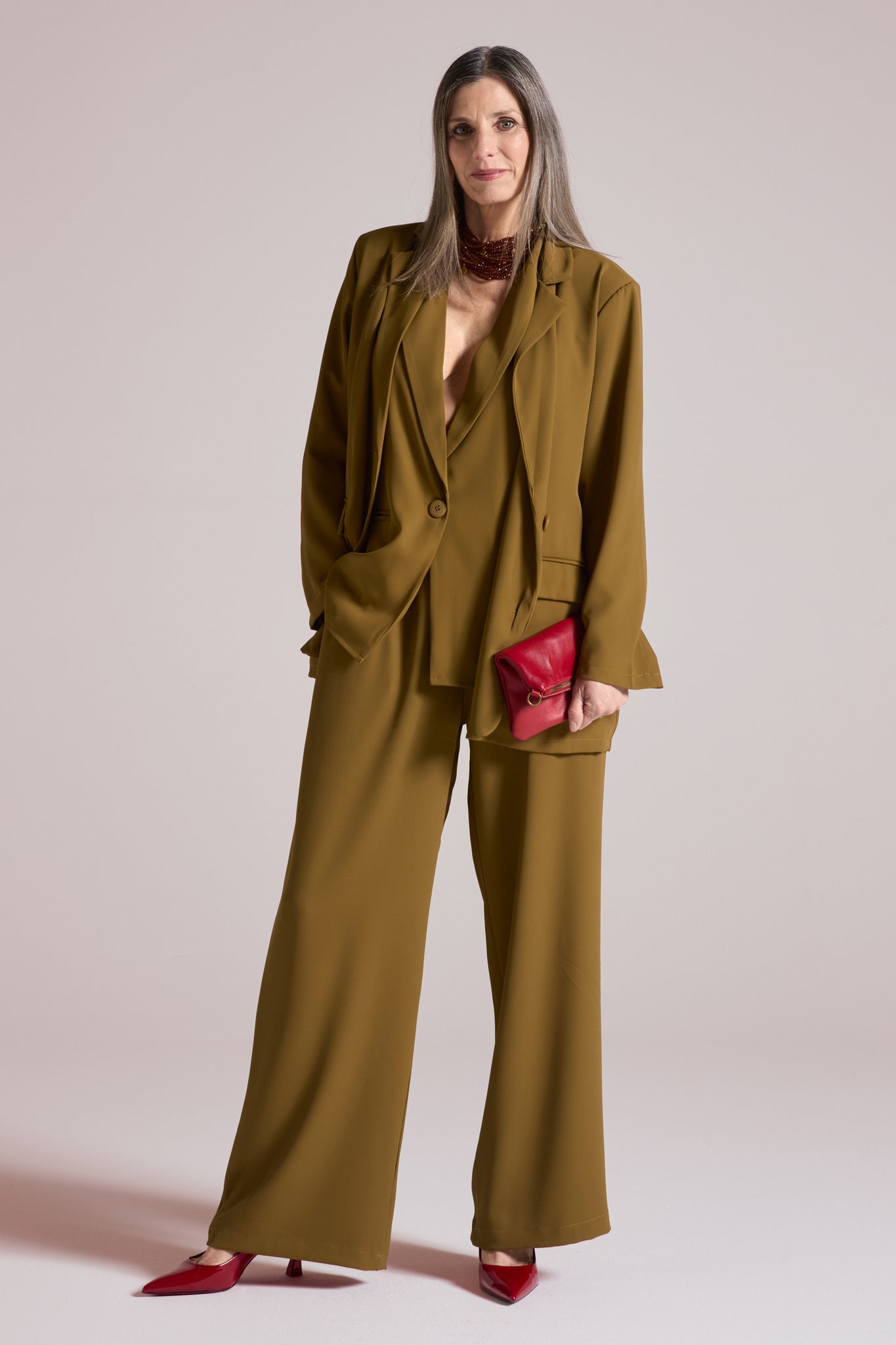 Pantalone a palazzo dalla struttura pulita e minimal, un capo dal fascino raffinato, pensato per unire comfort e stile in ogni momento della giornata; realizzato in tessuto fluido e leggero, che scivola delicatamente sulla silhouette garantendo una vestibilità impeccabile;