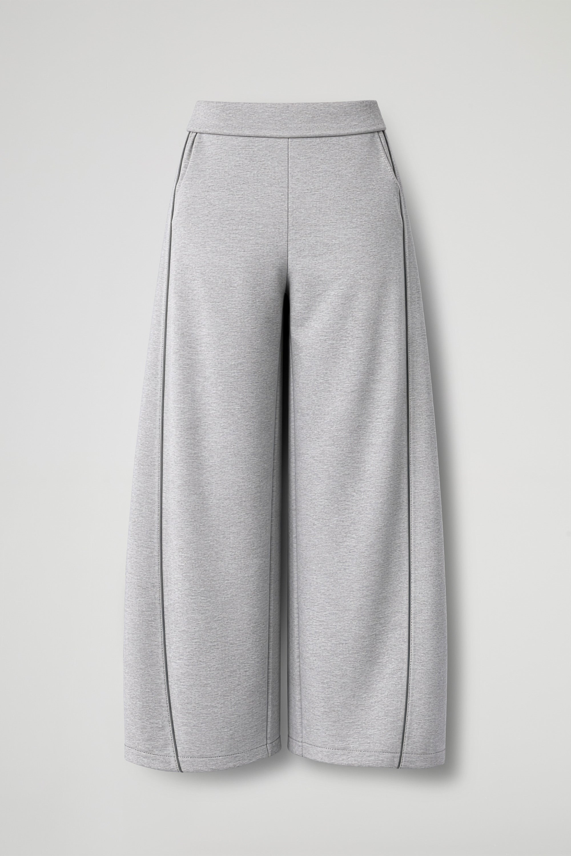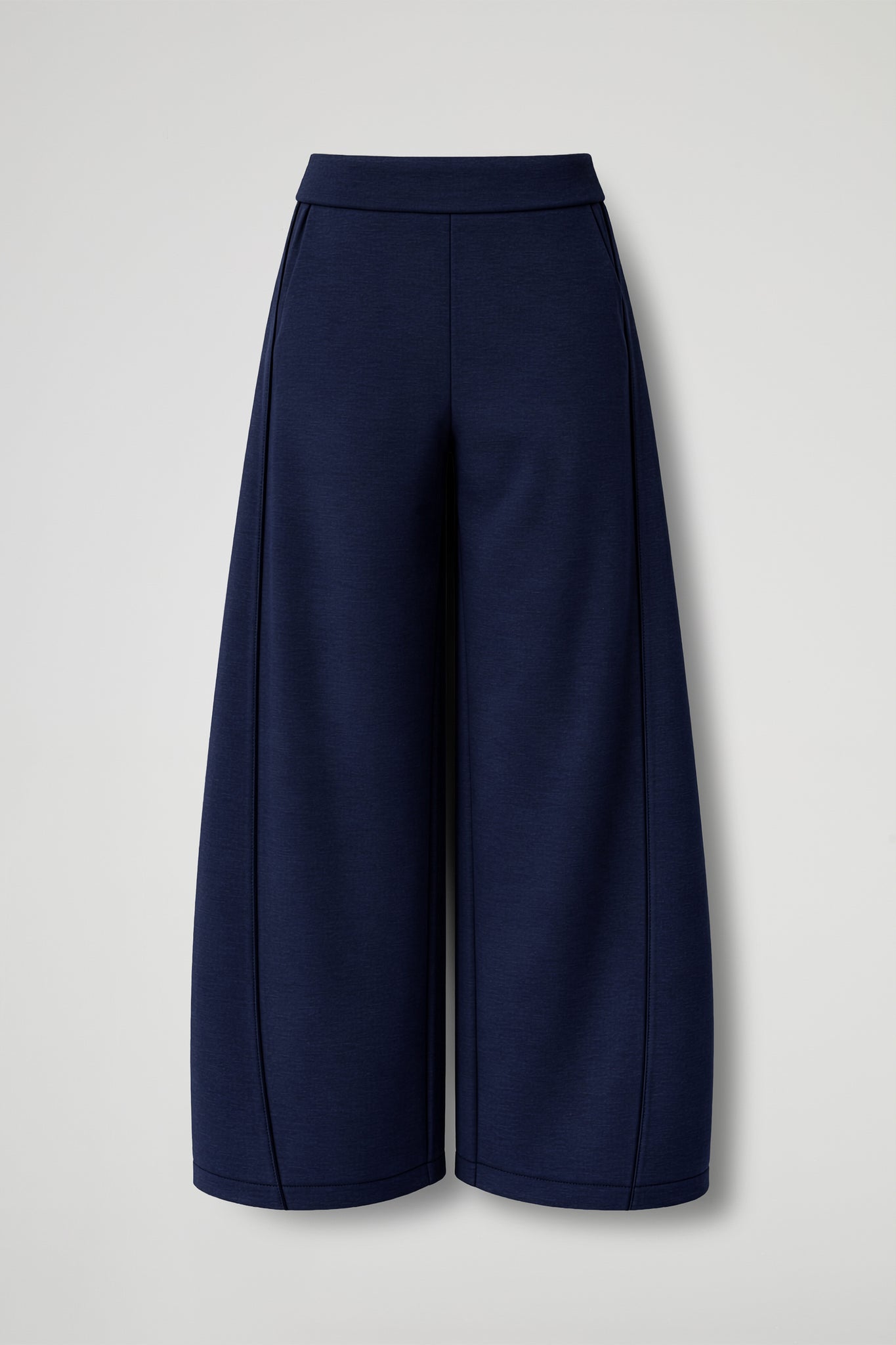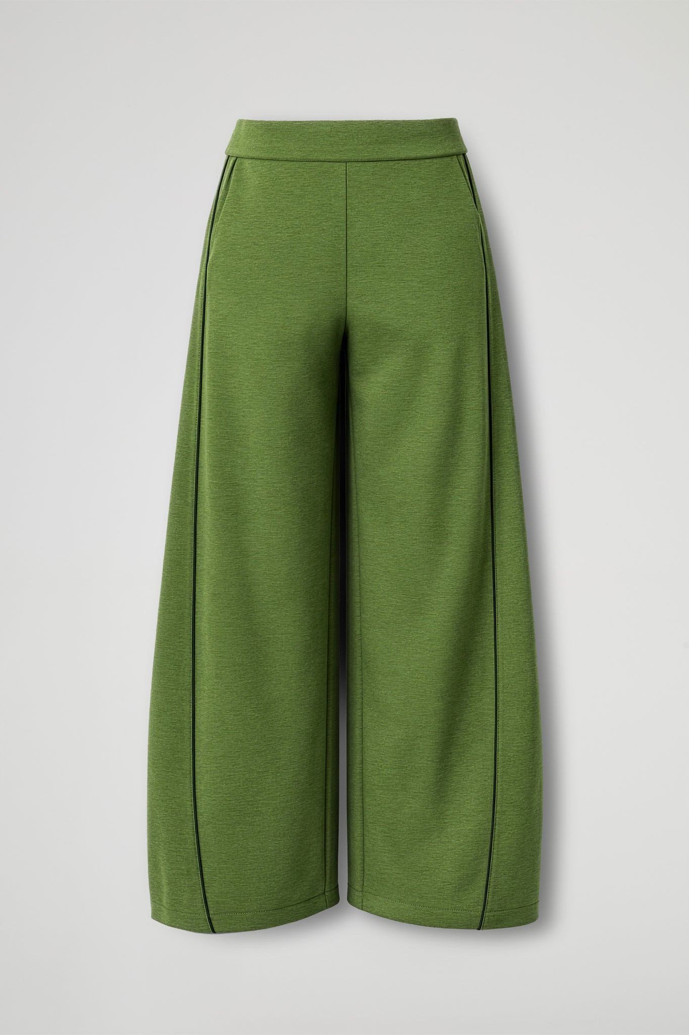 Pantalone dal fit contemporaneo, realizzato in tessuto di viscosa morbido e piacevole al tatto. La linea è ampia con gamba wide-leg, pensata per un look comodo ma curato. I tagli e le cuciture verticali laterali slanciano la figura, completati da un orlo pulito.