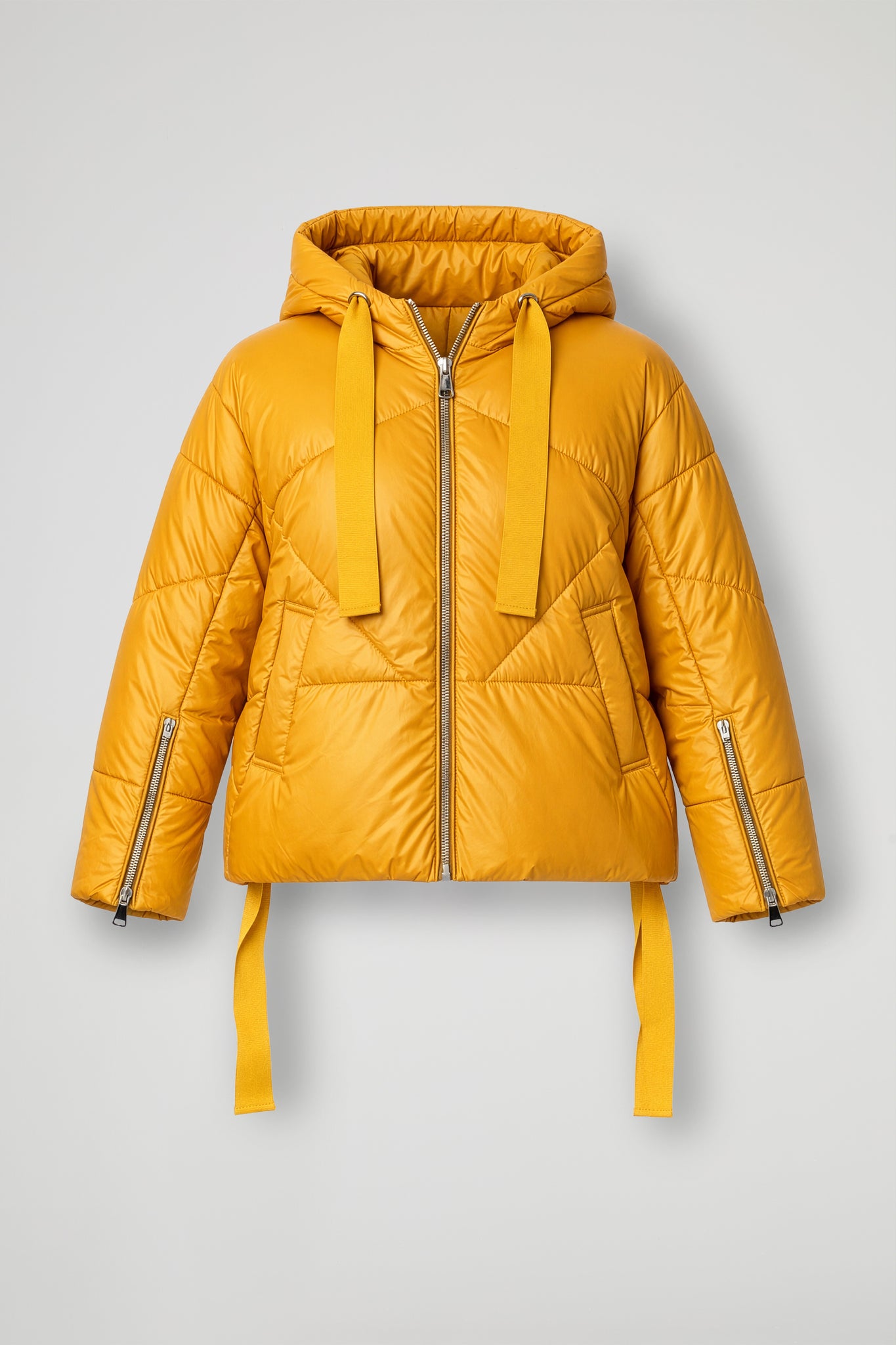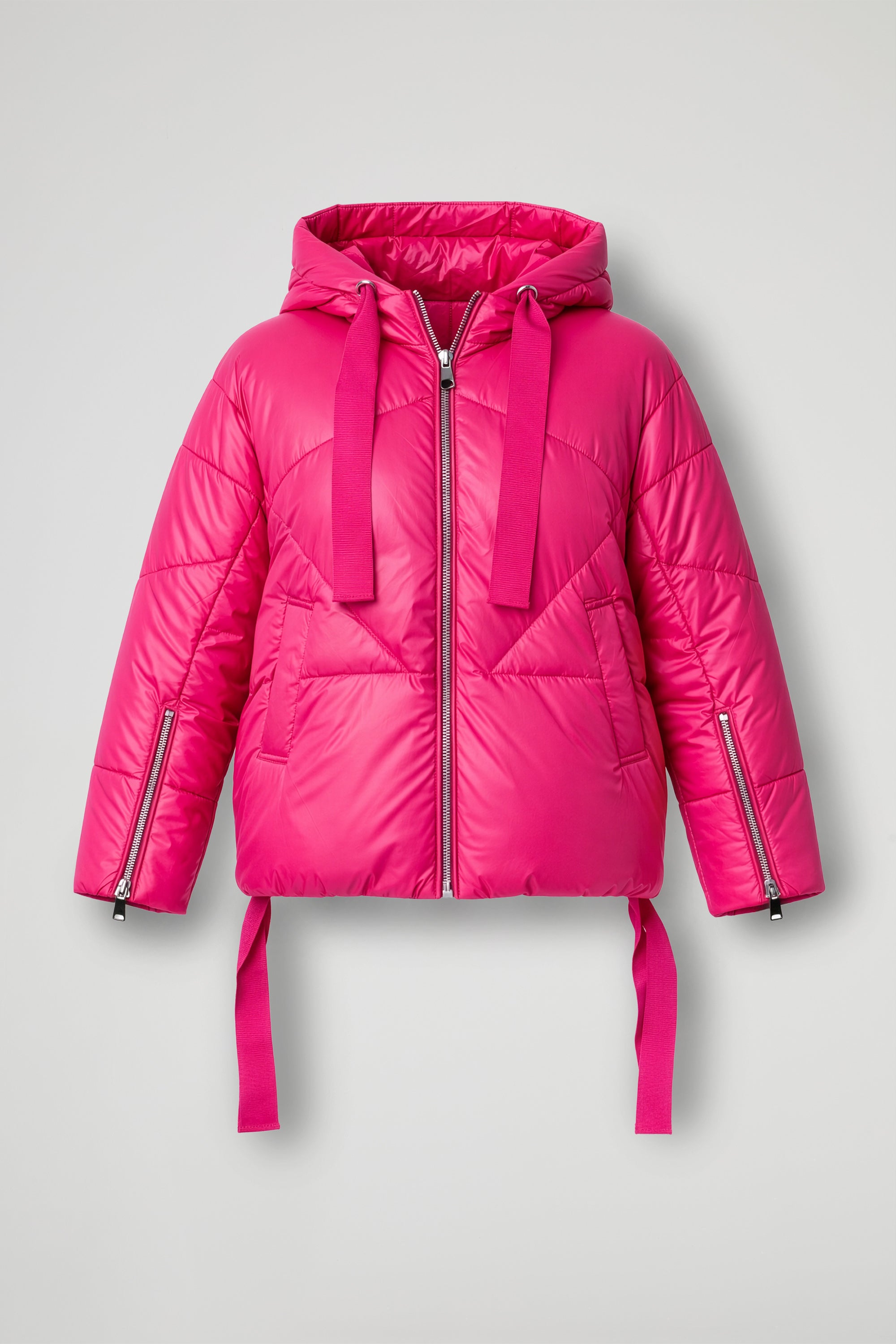 Piumino corto dal finish lucido, perfetto per aggiungere un tocco deciso al proprio look; Vestibilità confortevole, ideale da indossare ogni giorno, dotato di cappuccio avvolgente, chiusura frontale con zip e comode tasche laterali. Le zip ai polsi e i lacci extra-long completano il design con un dettaglio contemporaneo.