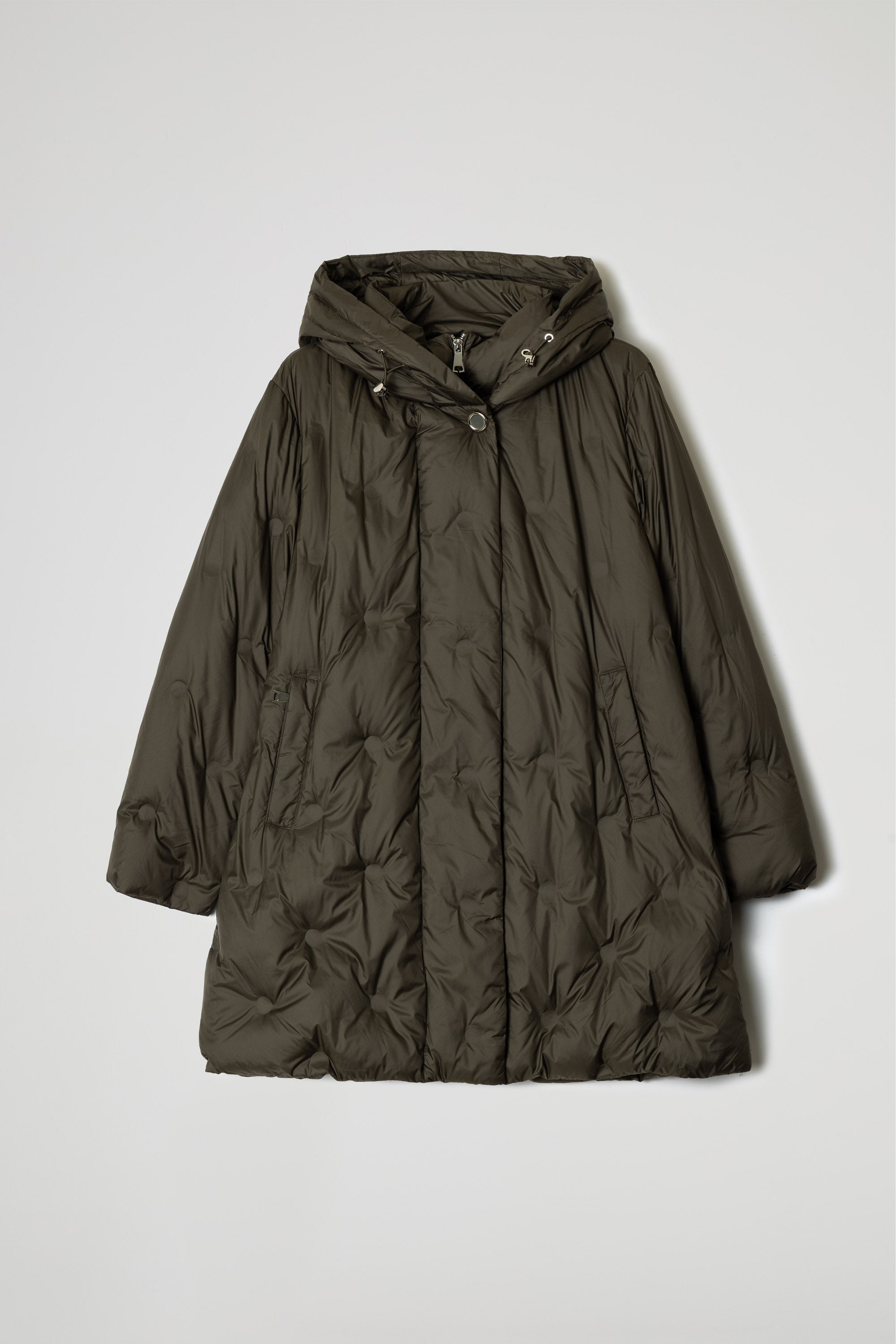 Piumino lungo over caratterizzato da una linea morbida e avvolgente, la trapuntatura a punti circolari su tutto il capo offre uno stile moderno, la linea leggermente svasata sul fondo consente una maggiore libertà di movimento.
