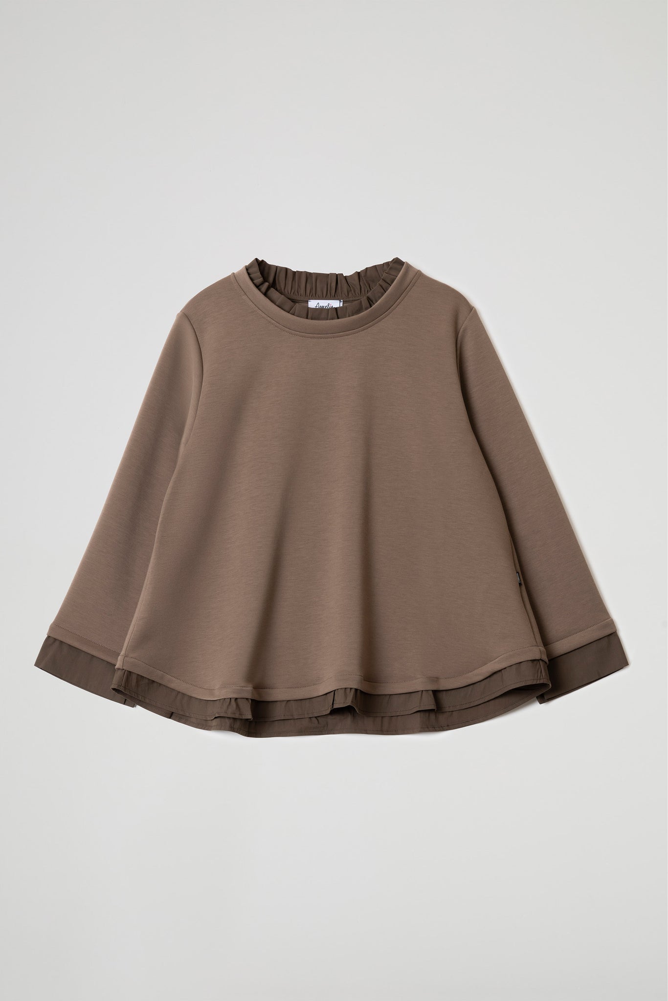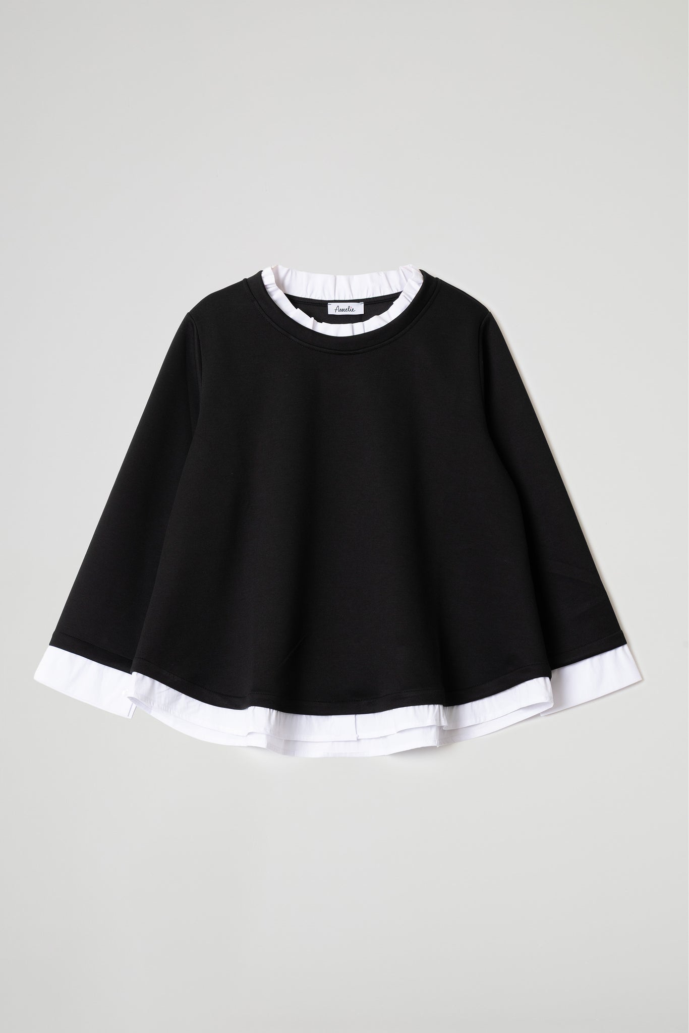 Top a trapezio in tessuto fluido di viscosa, scollo rotondo con dettaglio colletto in rouches in popeline, manica lunga, dettaglio popeline su manica e fondo.
