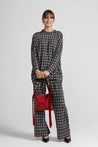 Top over asimmetrico in tessuto tecnico, collo alla coreana, manica lunga leggermente a sbuffo, orlo ribattuto alto su polsi e fondo, fantasia geometrica su tutto il capo. Linea ampia e morbida.