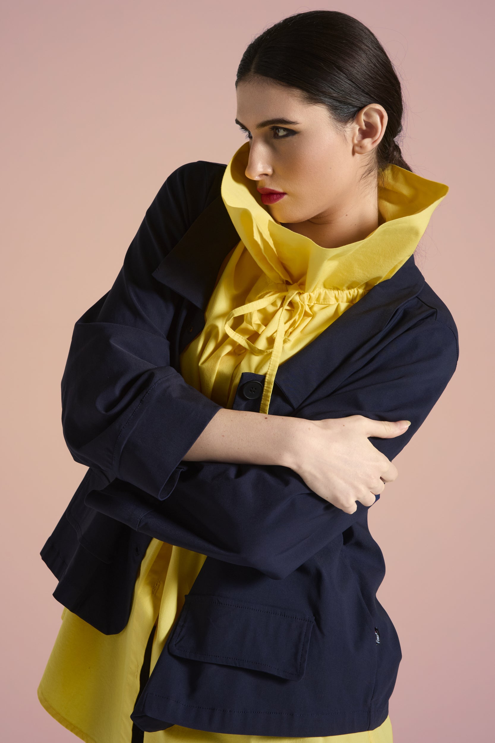 Camicia over, colletto ampio arricciato con dettaglio coulisse regolabile, maniche a ¾ dal taglio ampio, chiusura frontale con bottoni in madre perla, fondo a petalo su entrambi i lati. Linea morbida