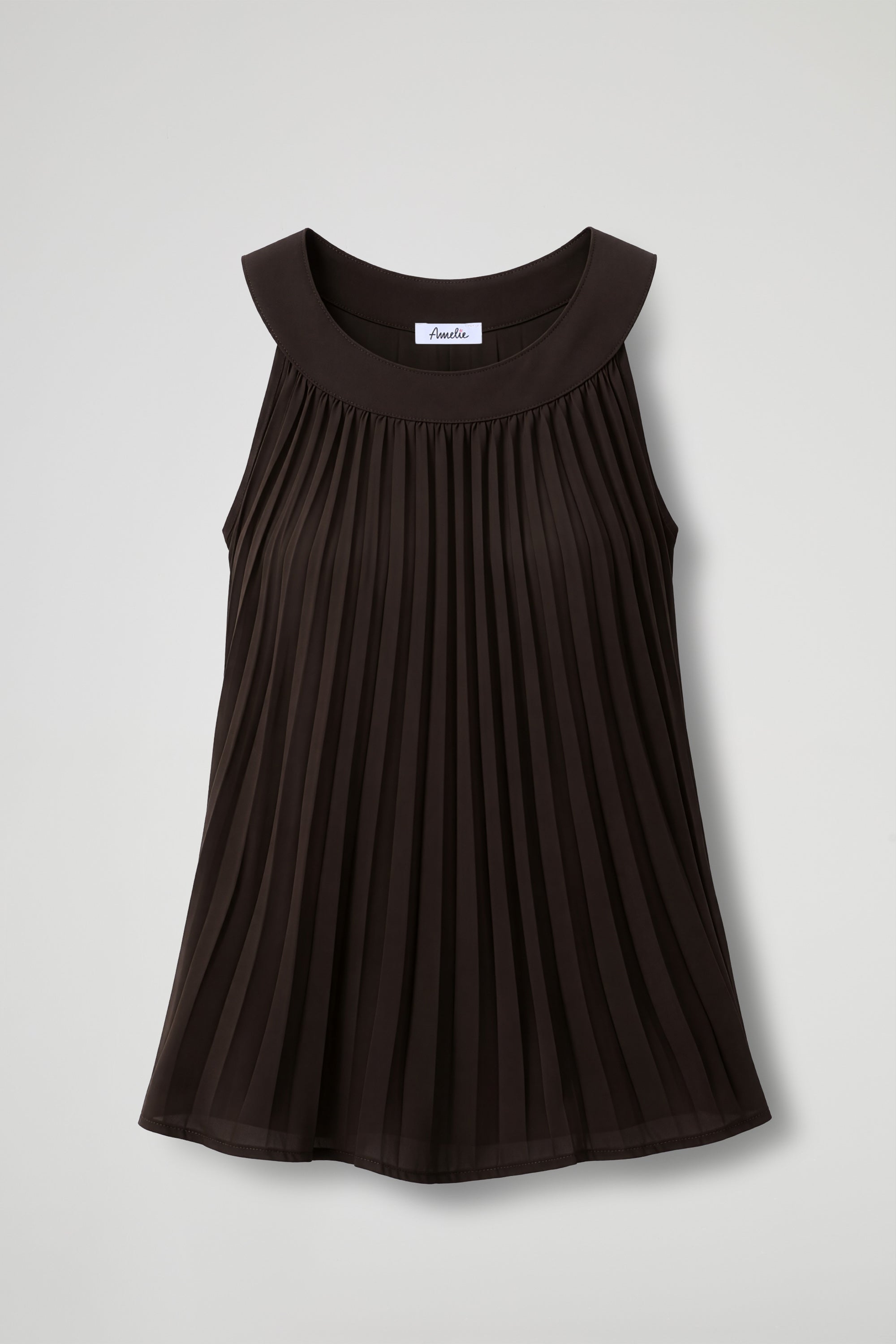 Top smanicato plissé dal design pulito e raffinato, con collo ampio e strutturato che incornicia le spalle e dona un tocco elegante. La linea è morbida e leggermente svasata, pensata per cadere fluida sul corpo e valorizzare il movimento delle pieghe.