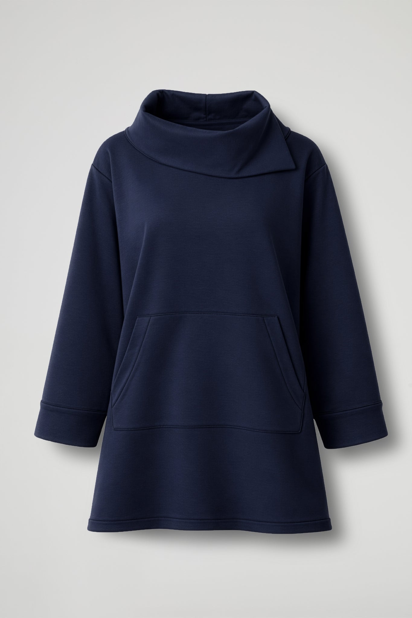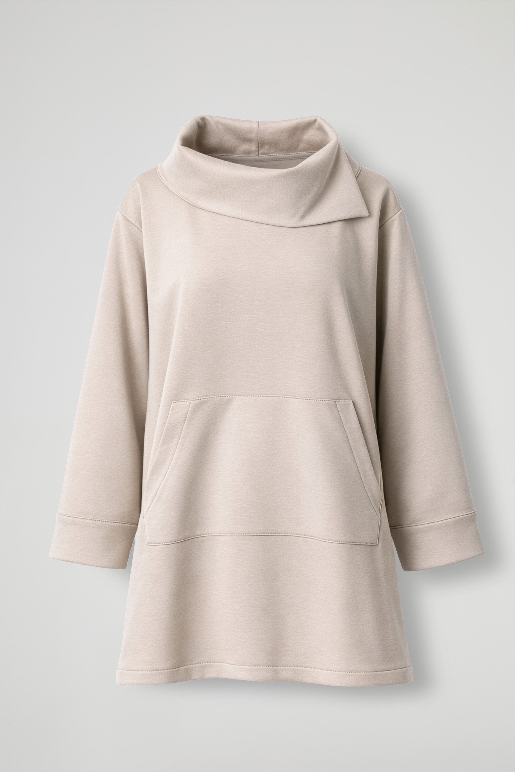 Felpa a trapezio, collo alto drappeggiato con spacchetto laterale, manica lunga con risvolto sul fondo, maxi tasca a marsupio frontale, spacchetti sul fondo. Linea ampia