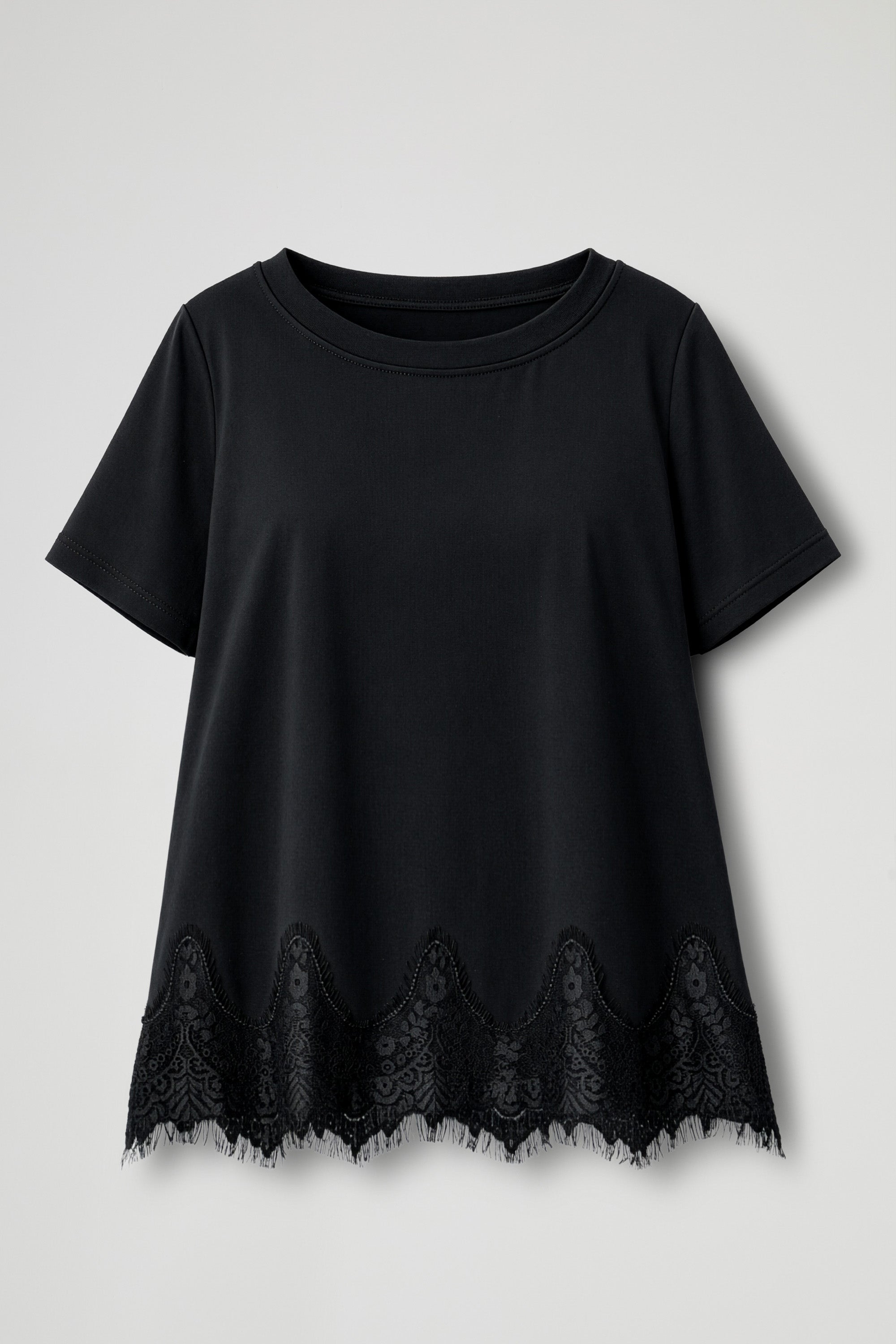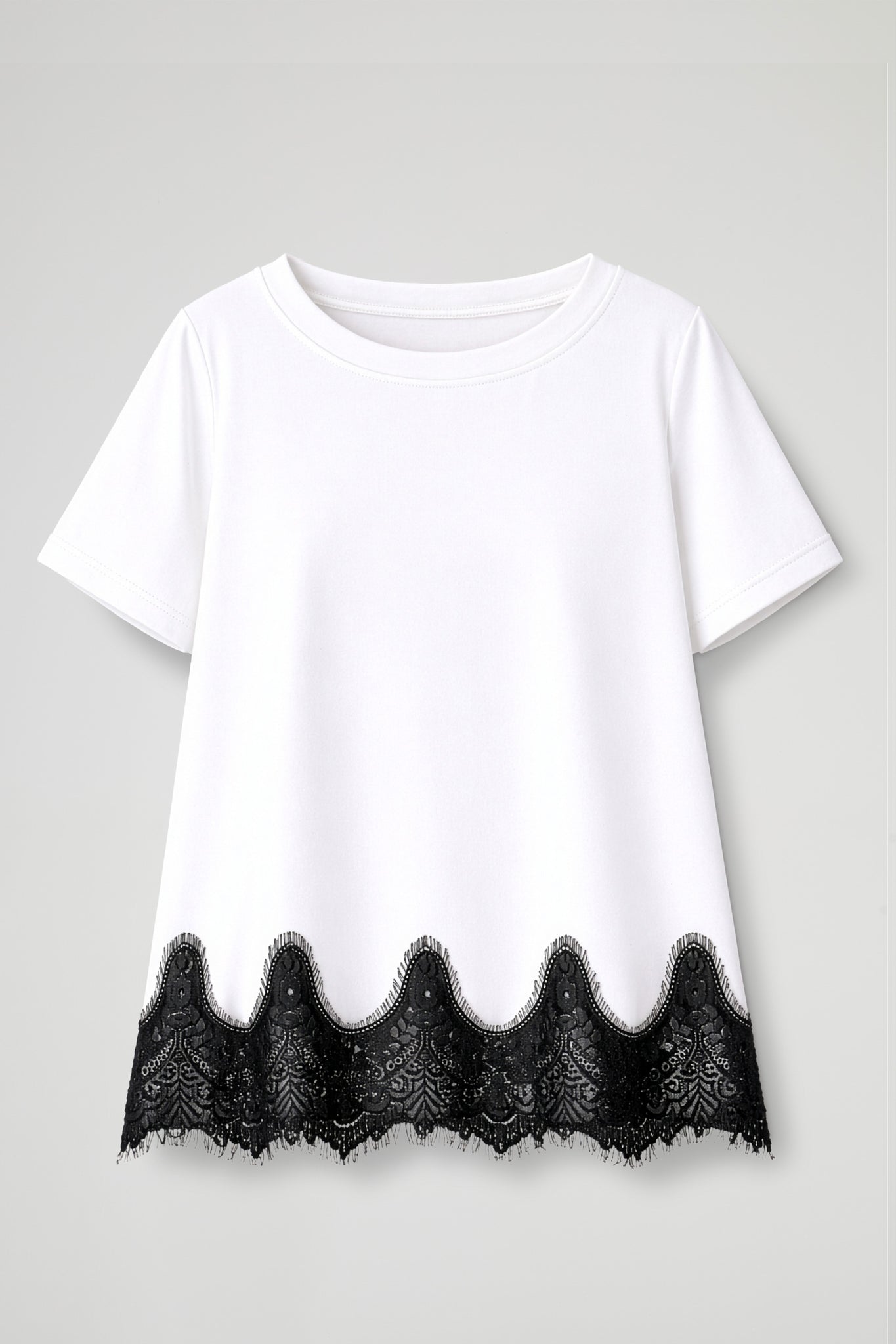 T-shirt dal design minimal arricchita da un 'elegante bordatura in pizzo sul fono che crea un contrasto sofisticato e dona al capo un tocco femminile e ricercato; Il modello presenta girocollo classico e maniche corte, con una linea morbida e confortevole.