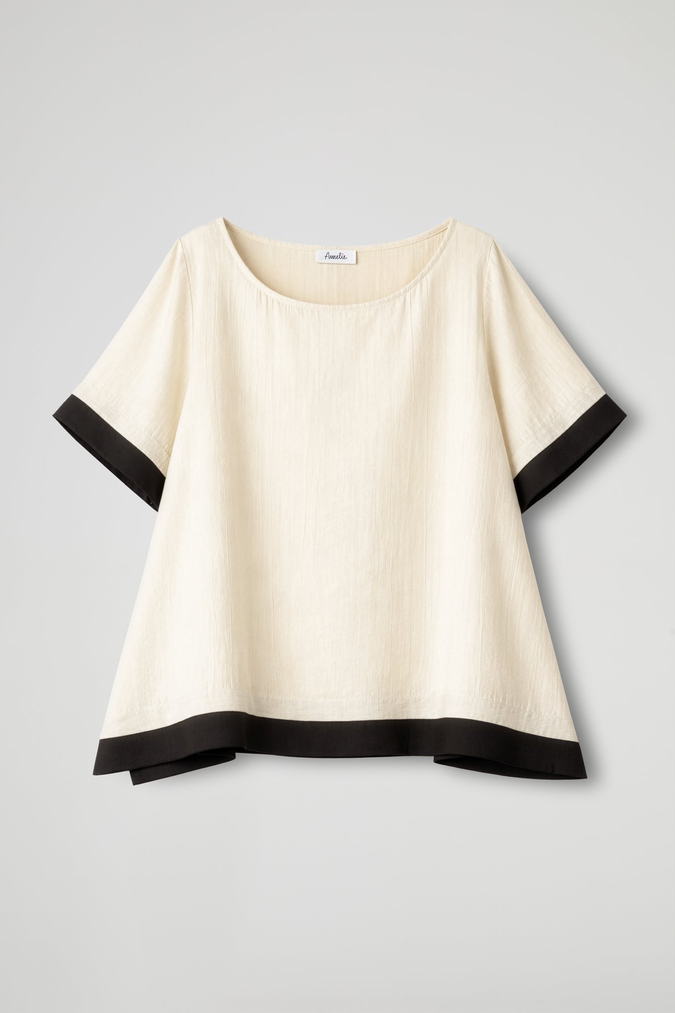 Maglia taglio a trapezio, collo ampio e stondato, manica corta con dettaglio fascia a contrasto colore, dettaglio fascia a contrasto sul fondo. Linea ampia.