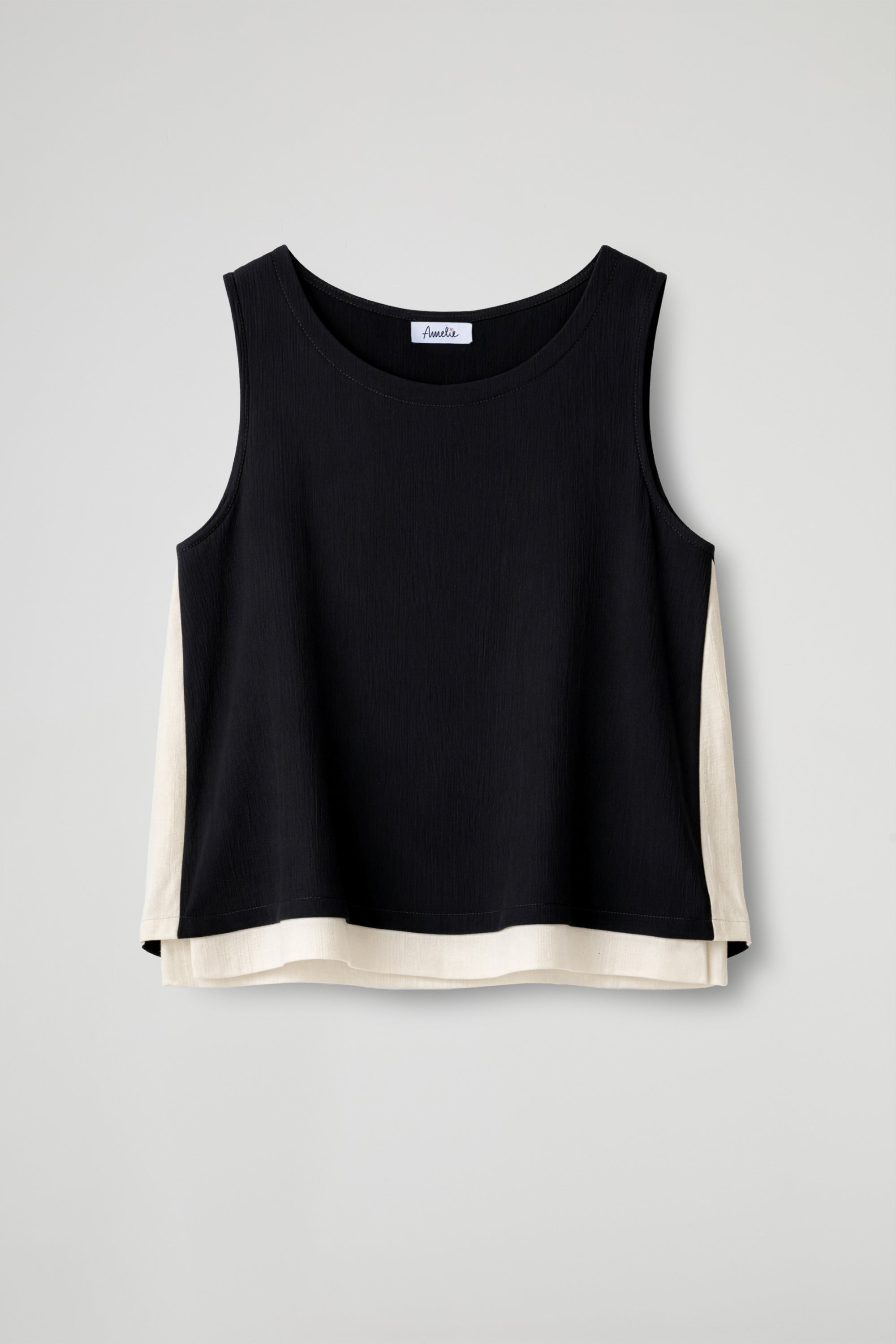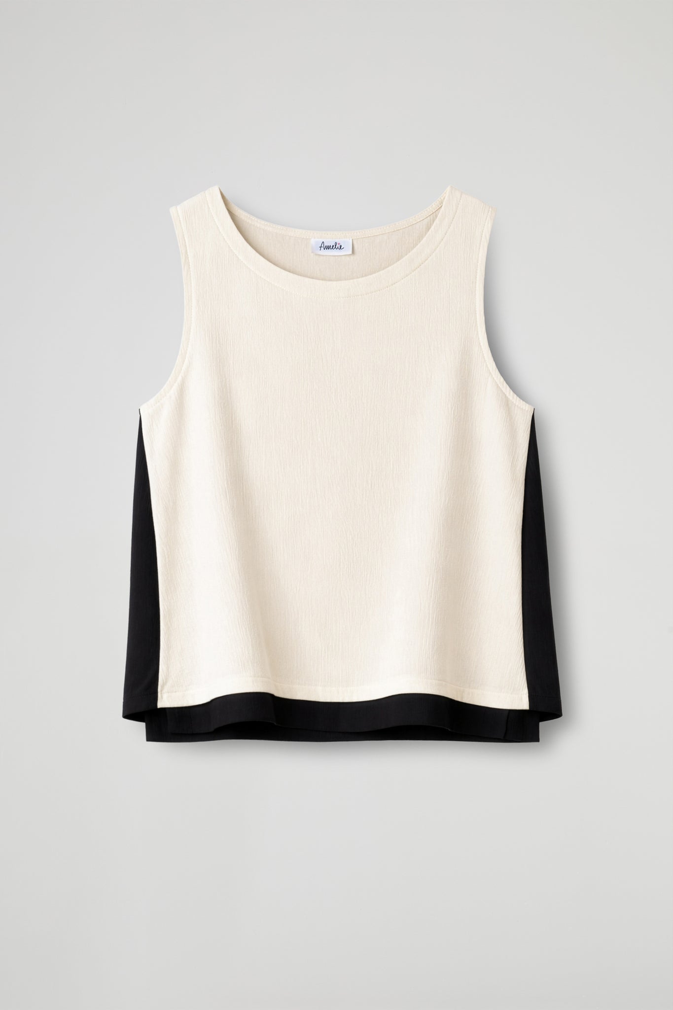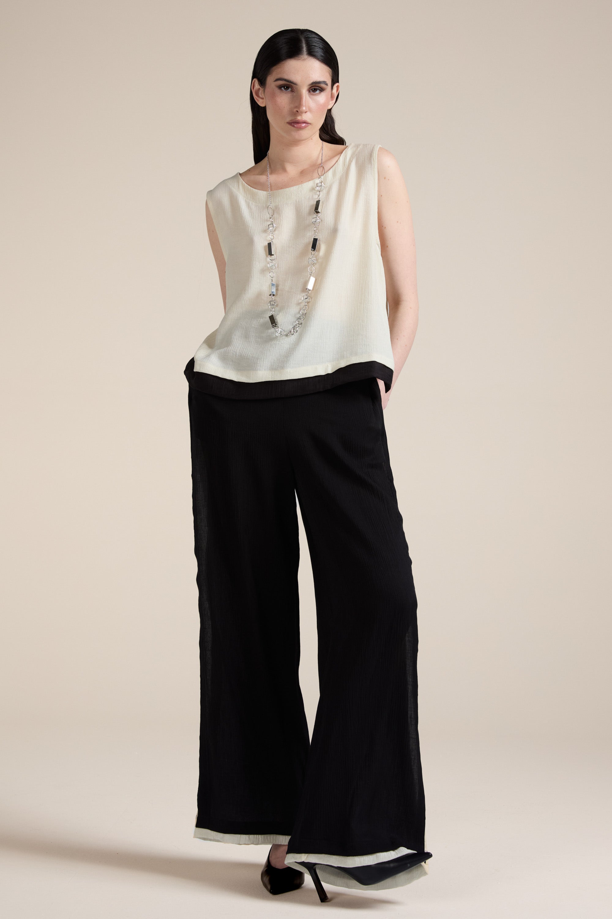 Top smanicato taglio boxy dal design contemporaneo, realizzato in tessuto leggero e leggermente trasparente, con una texture delicatamente stropicciata che dona movimento al capo; Il modello presenta uno scollo rotondo e una linea morbida e fluida, pensata per offrire comfort e vestibilità rilassata; il capo è valorizzato da inserti a contrasto in tonalità più chiare lungo i fianchi e il fondo, che creano un elegante gioco cromatico.