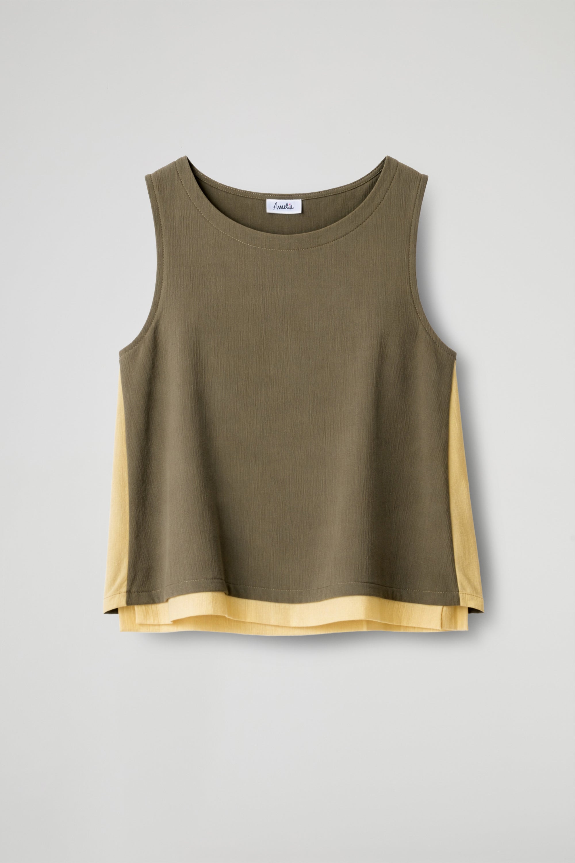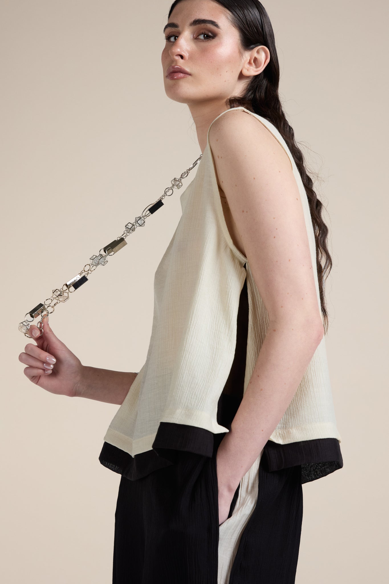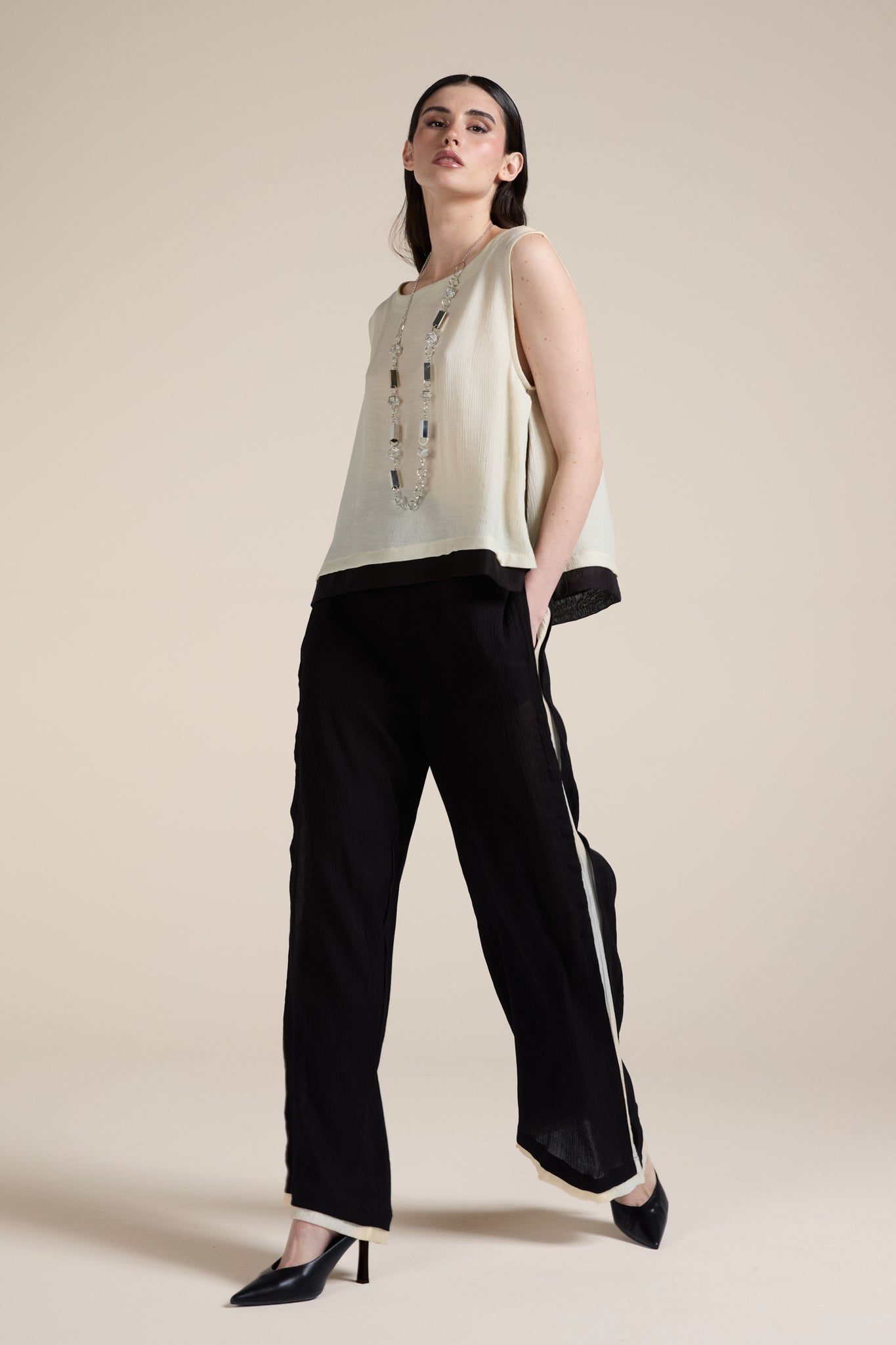Top smanicato taglio boxy dal design contemporaneo, realizzato in tessuto leggero e leggermente trasparente, con una texture delicatamente stropicciata che dona movimento al capo; Il modello presenta uno scollo rotondo e una linea morbida e fluida, pensata per offrire comfort e vestibilità rilassata; il capo è valorizzato da inserti a contrasto in tonalità più chiare lungo i fianchi e il fondo, che creano un elegante gioco cromatico.